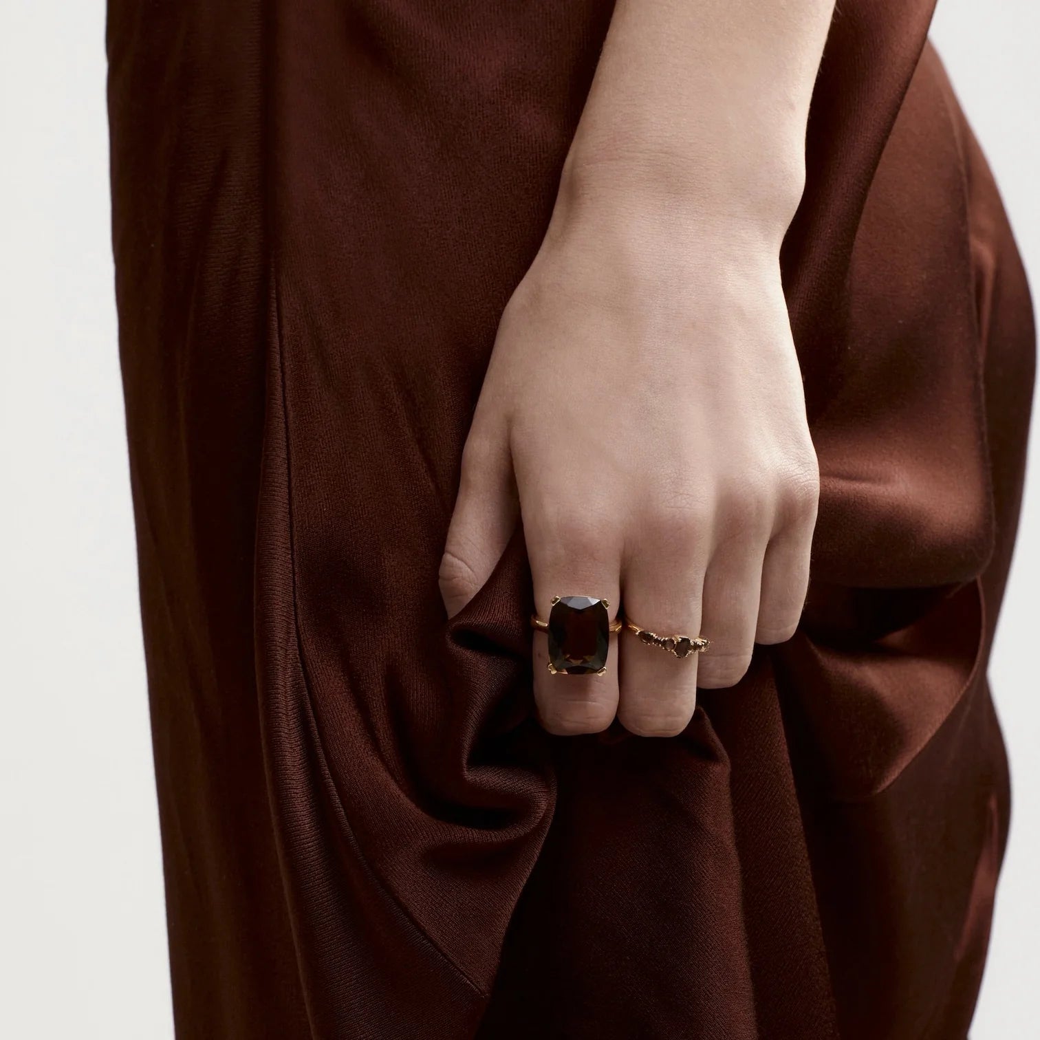 It's hard to resist this stunning handcrafted Silk & Steel Goddess gold ring! The large cushion-cut smokey quartz gemstone is handset in 14k gold-plated sterling silver and looks beautiful on its own or with our Theia rings, for a more-is-more modern-vintage vibe.