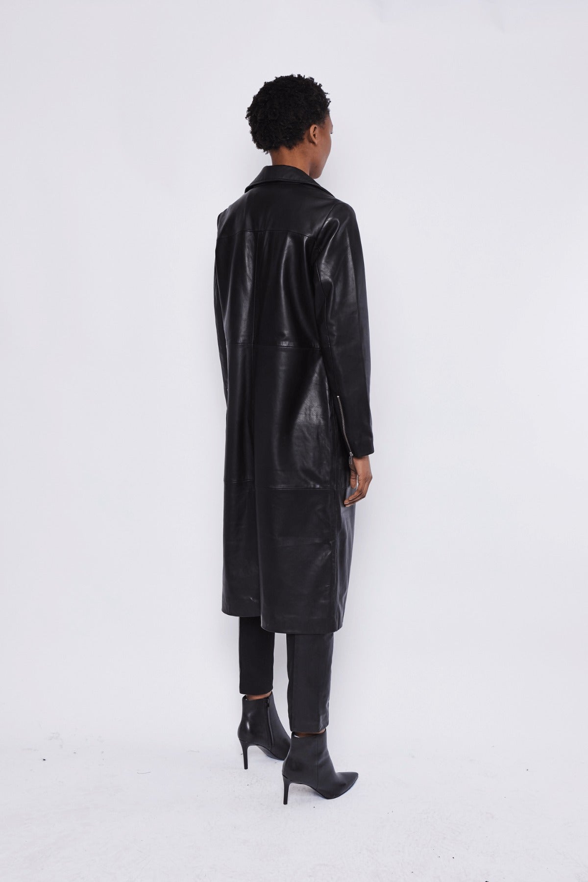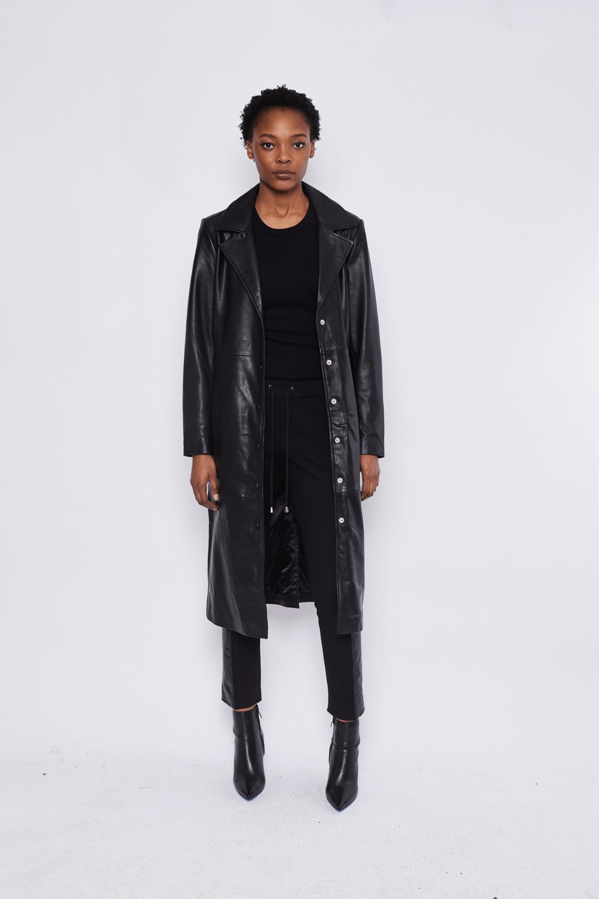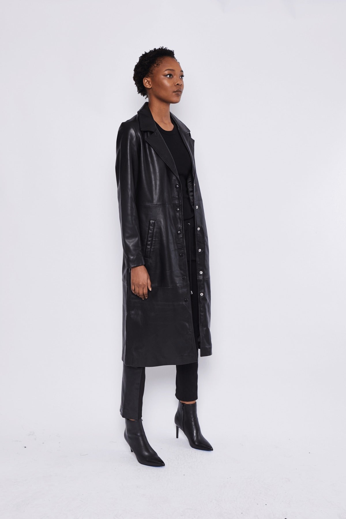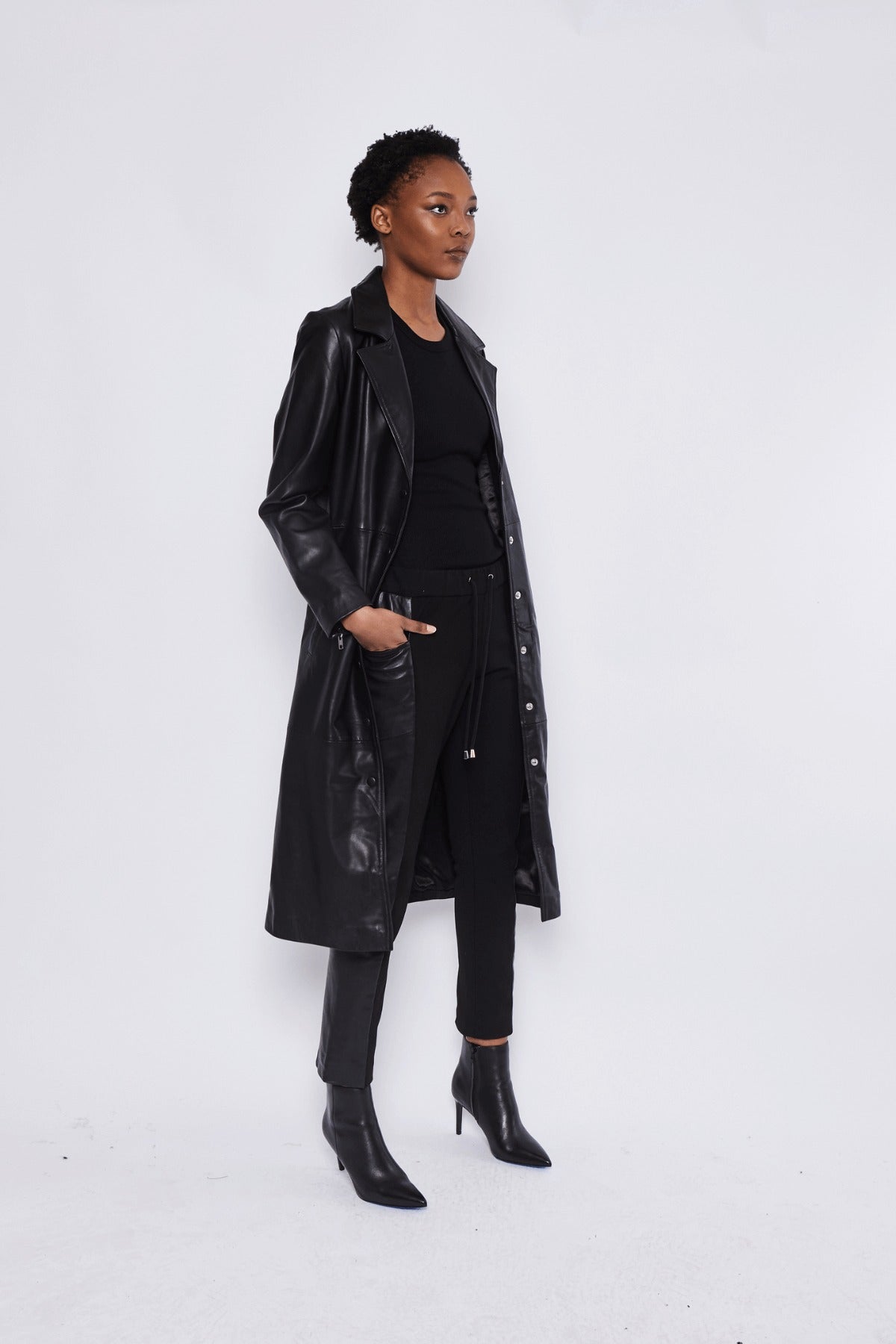 The Erin leather trench coat in Black by DEA The Label blends tailored structure with zip-cuff edge—100% leather, a statement piece for your winter wardrobe. The Erin Trench delivers a sleek edge with timeless structure. Crafted from 100% leather, it pairs perfectly with wide-leg trousers in Wellington or over a knit midi in Dunedin. Zip sleeves and dome buttons finish the look with attitude.