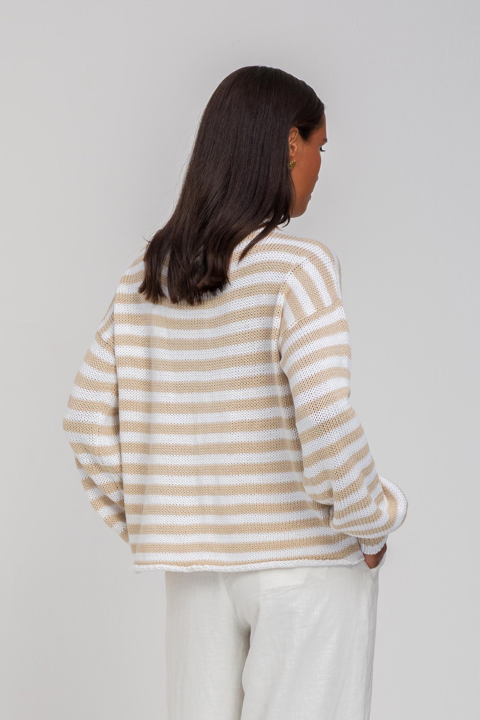 Crafted from luxurious cotton yarn, our Hold Me Back Jumper features a striking camel/white stripe design. The perfect combination of comfort and style, this knitwear piece boasts a mock collar, drop shoulder, long sleeves, and a straight hem for a modern and boxy fit. Experience the ultimate in quality and fashion with our must-have jumper!
