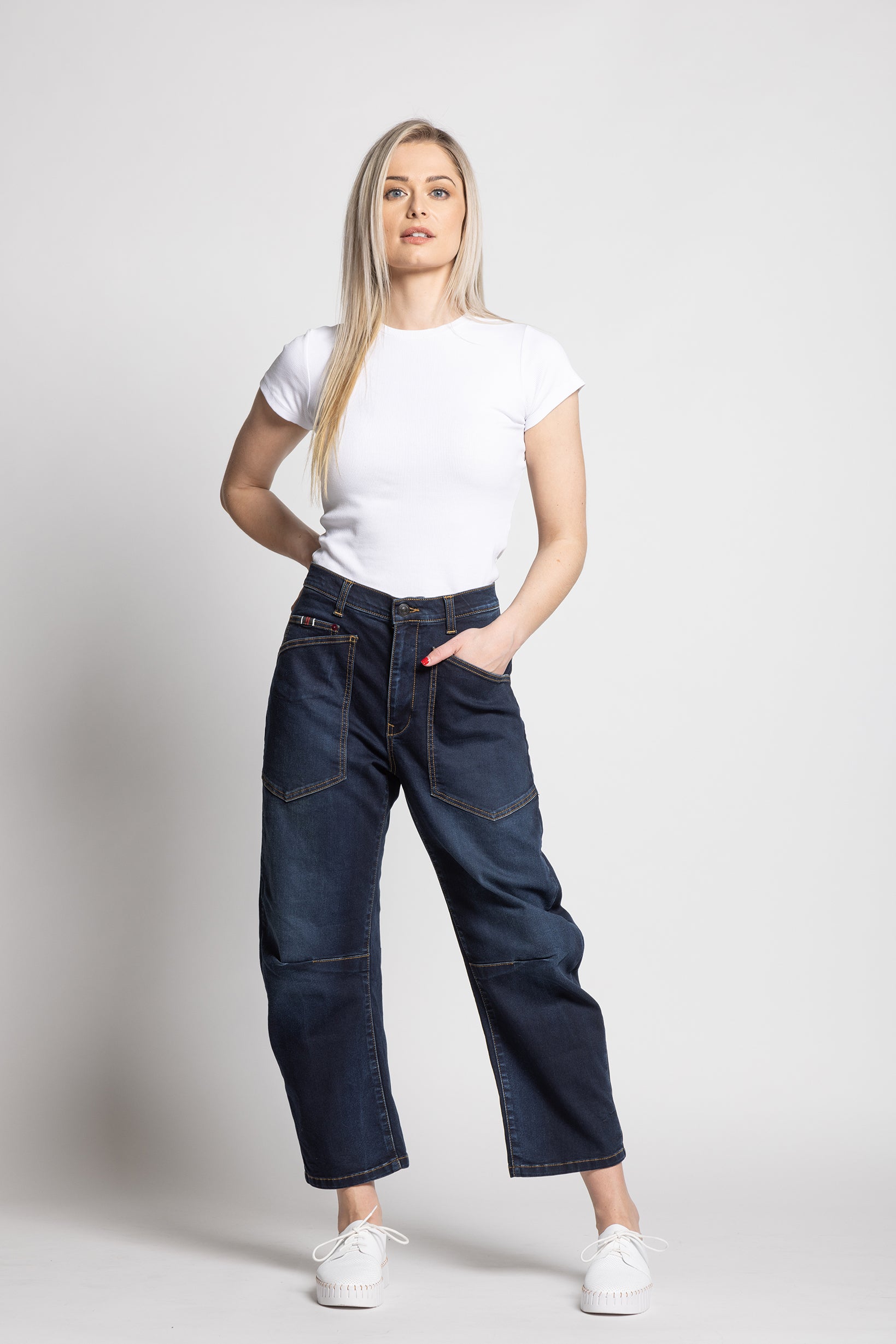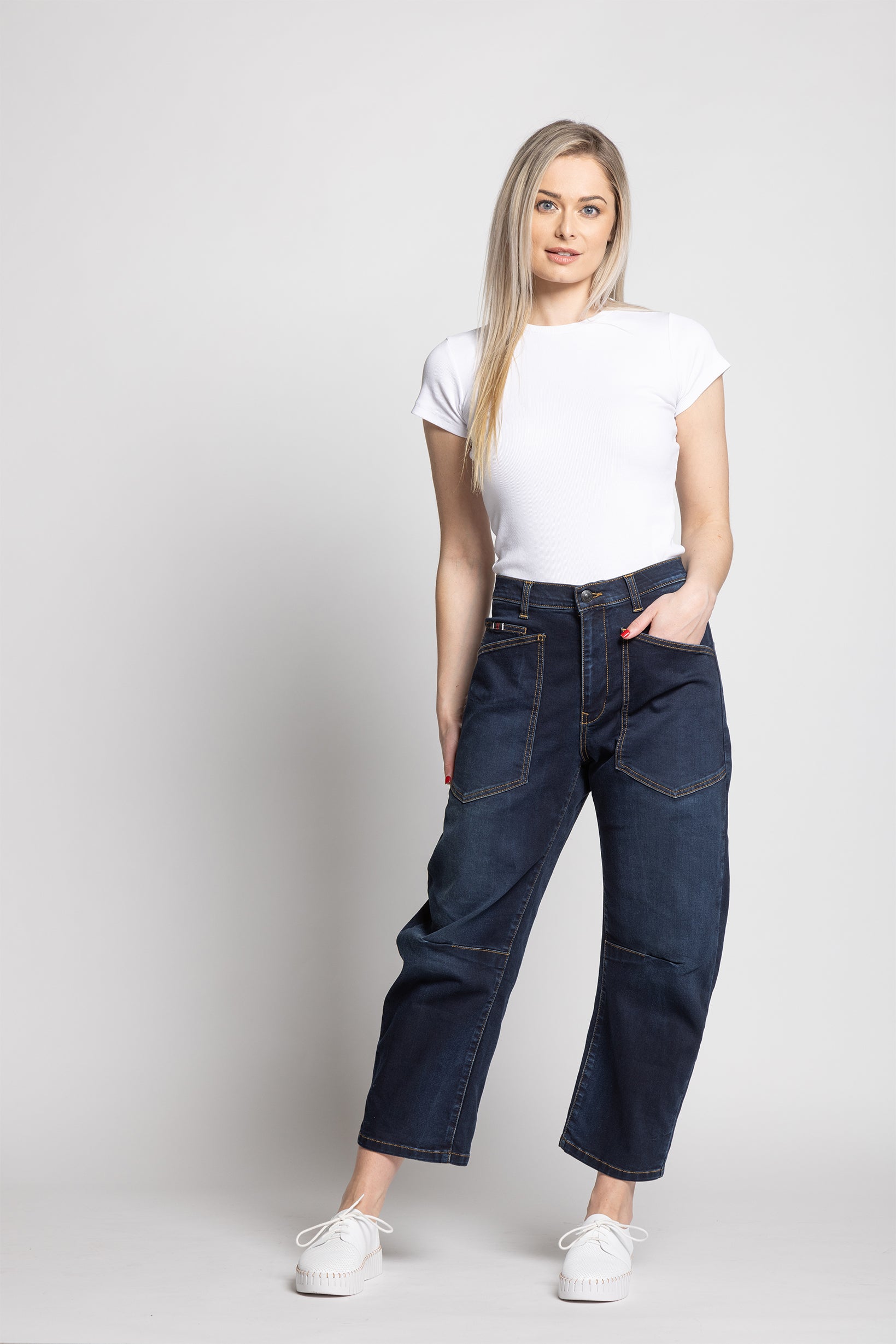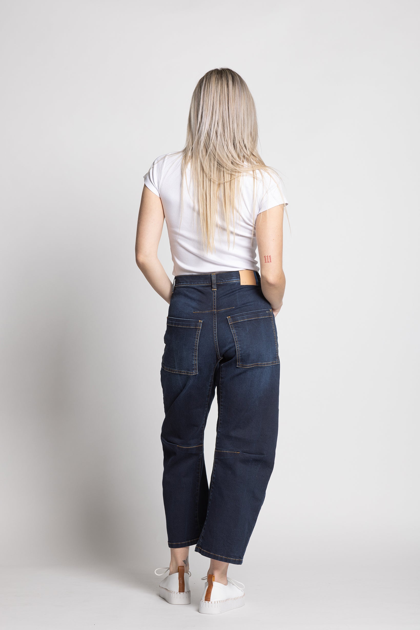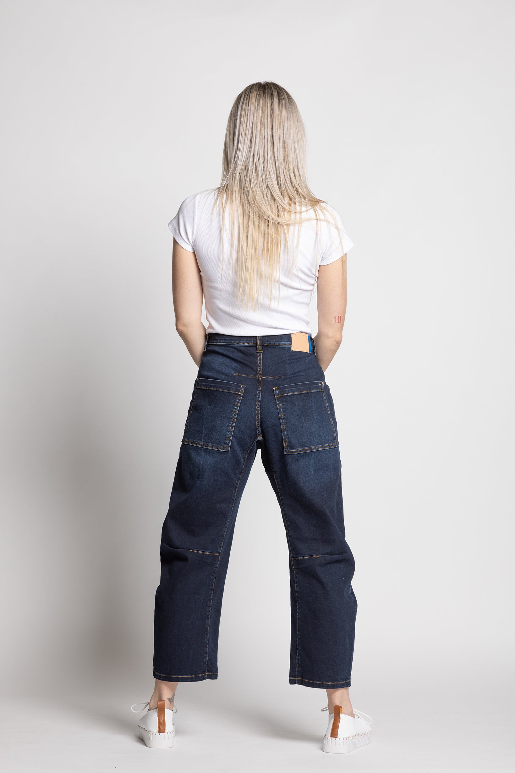 These dark-wash jeans feature a generous mid rise. The barrel cut is slightly curved through the leg, tapering at the ankle to create a subtle, rounded silhouette — giving the jeans a modern, architectural shape.