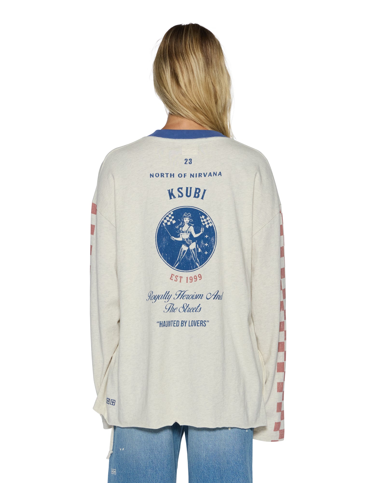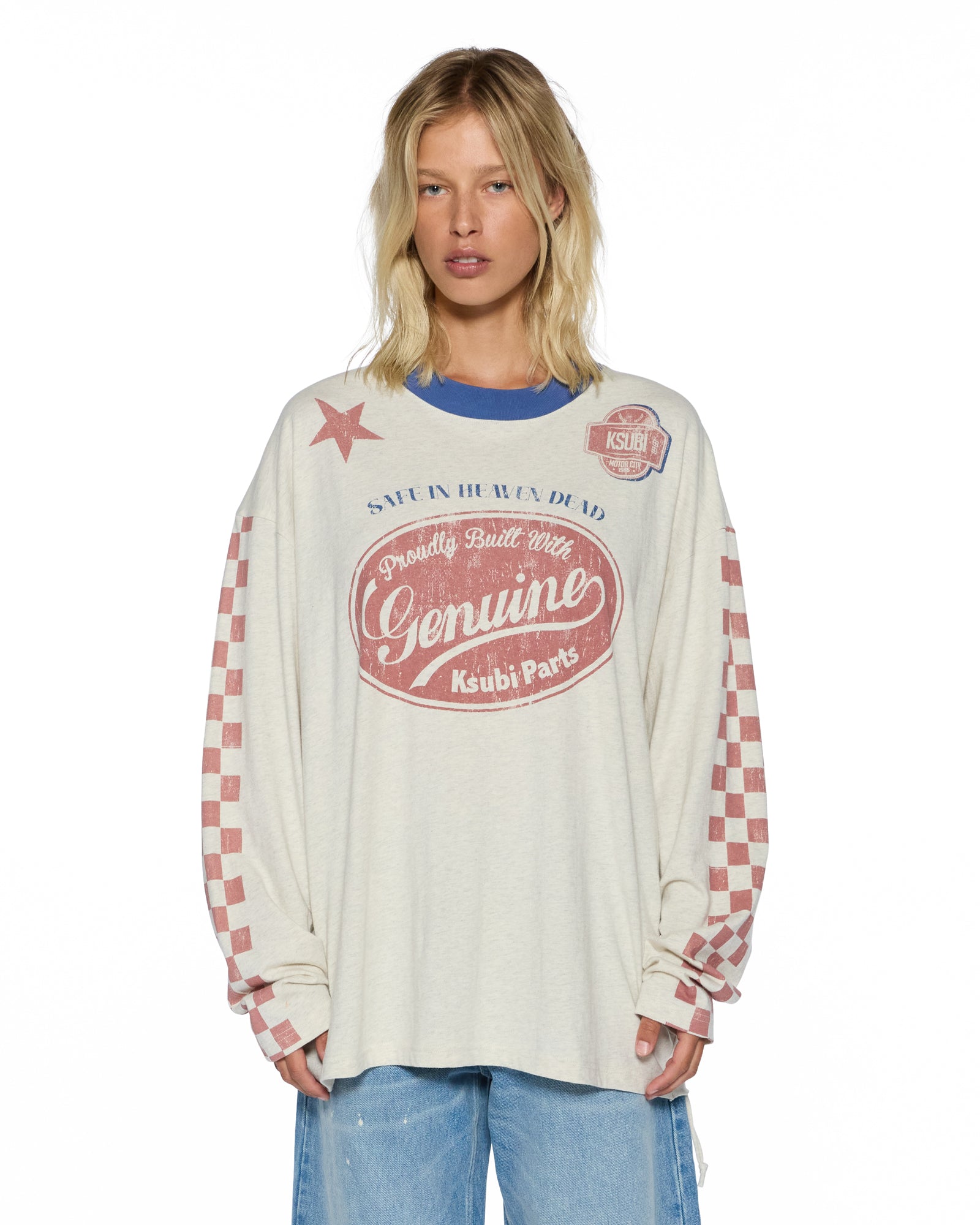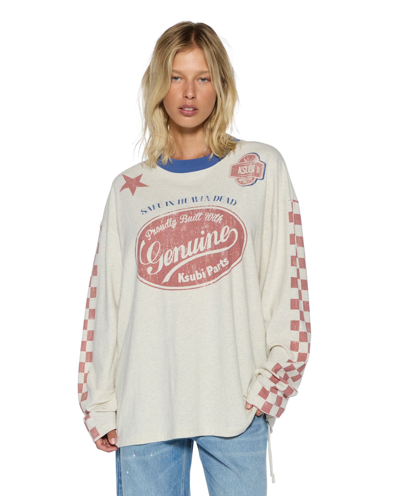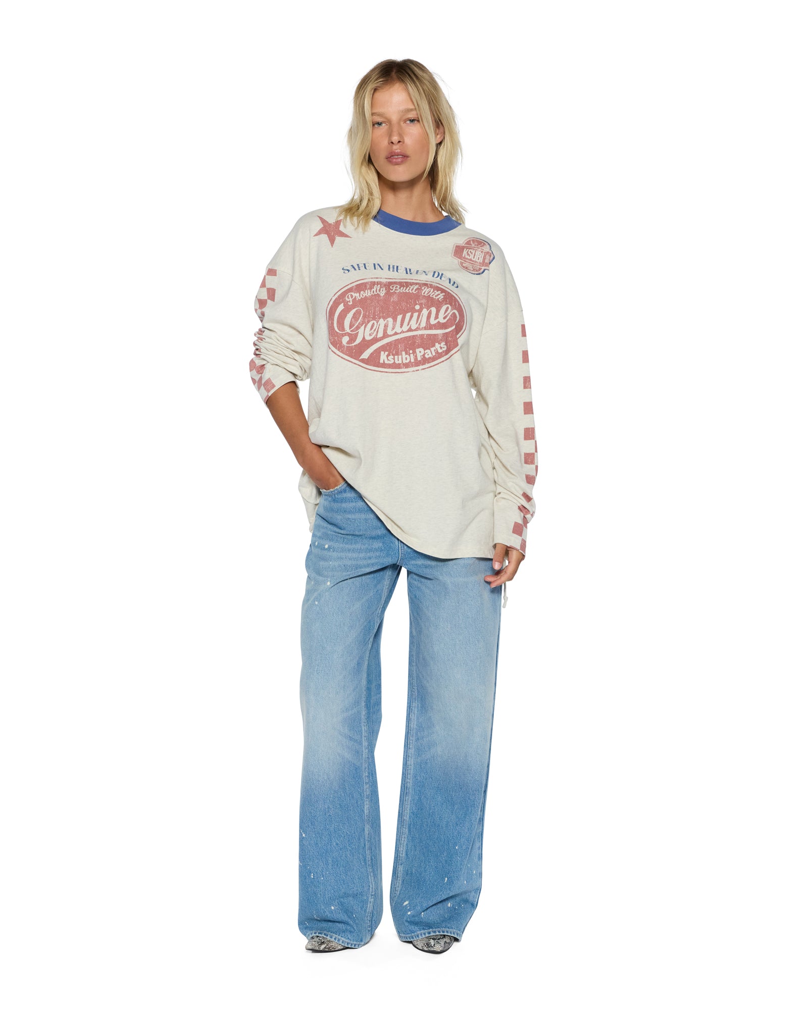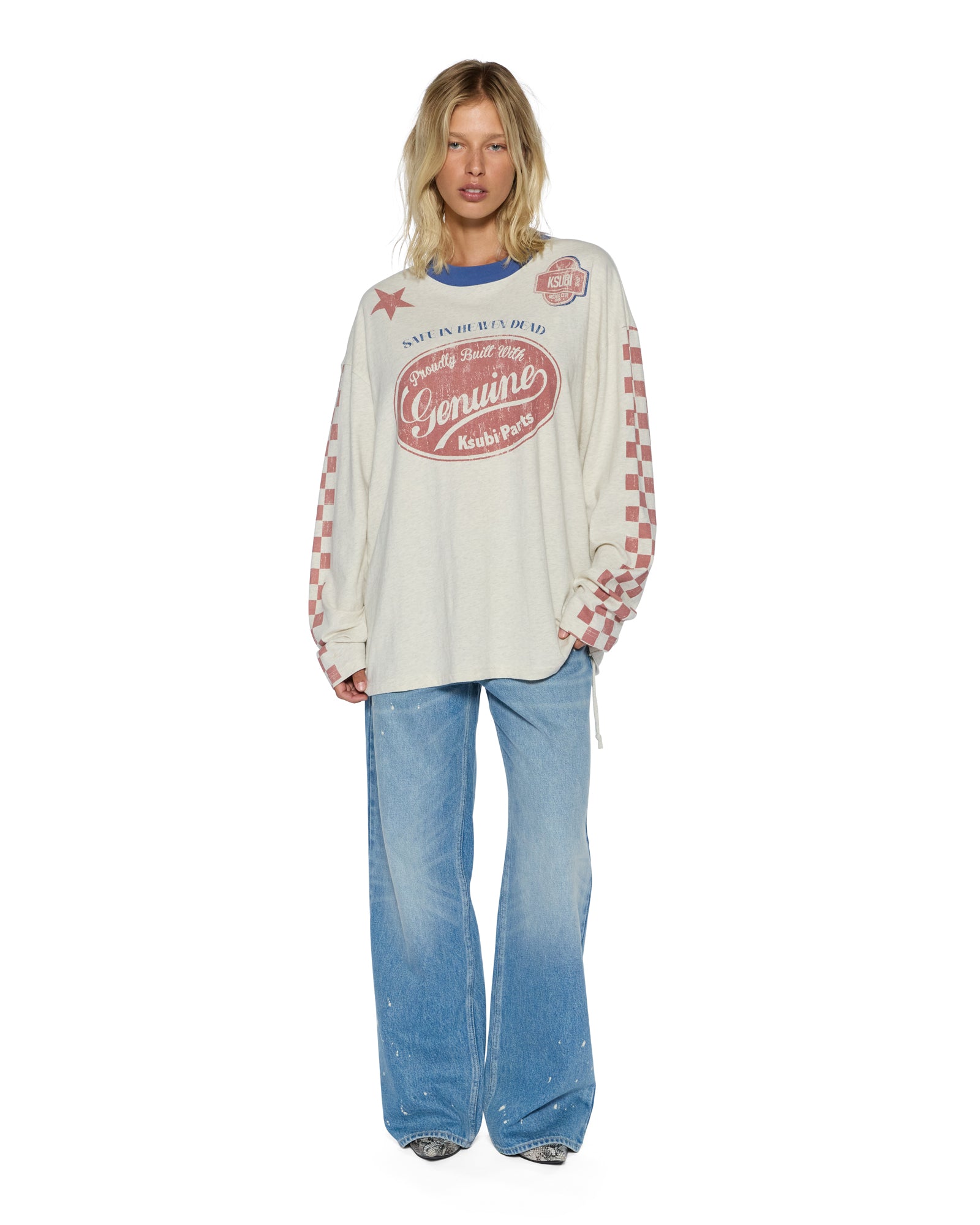 Boxy oversized fitting long sleeve t-shirt with a dropped shoulder and raw cut back hem. Detailed with a reversed overlocked side seam signature rats tail. Made from a premium heavy weight cotton jersey in a Oat Marle colourway with an aged wash for a vintage handfeel. Featuring seasonal Ksubi aged graphics all over and finished with t-box branding.
