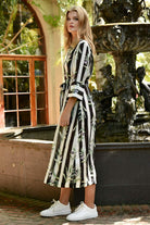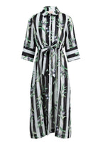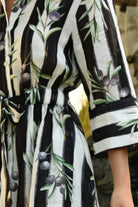 A fresh take on stripes, the ‘Stripe A Pose’ dress features a bold black and white stripe peppered with a fresh olive branch print. Crafted in ‘Olive Branch’ ramie, this dress sports a button through front complete with a simple collar and elasticated channels at the waist for creating your desired silhouette. Deep cuffs add a structural element making this an office-friendly choice.