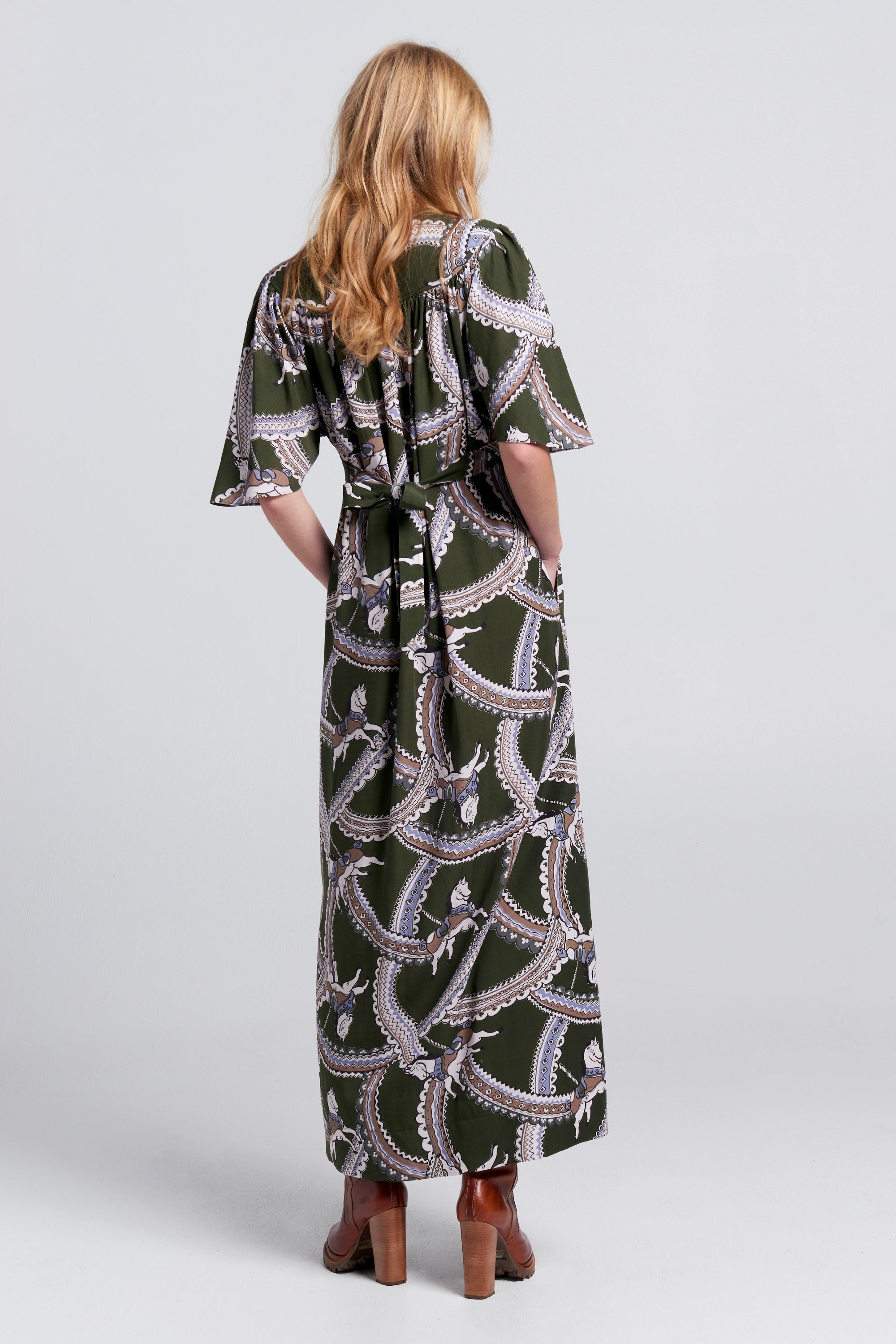 The Jamboree Dress in our carousel Tencel linen blend is a signature KW statement piece. Featuring dual western-inspired yokes, delicate gathering, and a tie-back waist, it delivers both whimsy and ease in the playful Carousel Horse print.