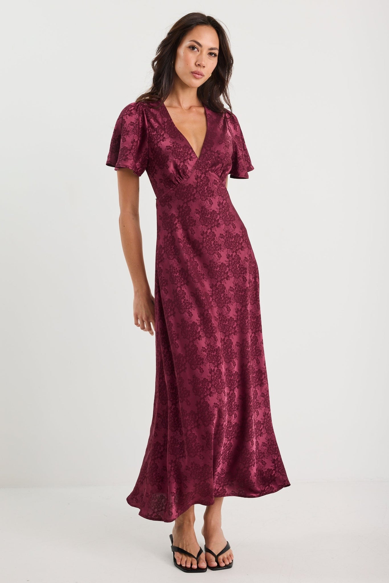 A romantic silhouette with a vintage-inspired touch, this jacquard maxi dress features a soft floral pattern and flattering bias cut. Perfect for evening wear or elevated day dressing.