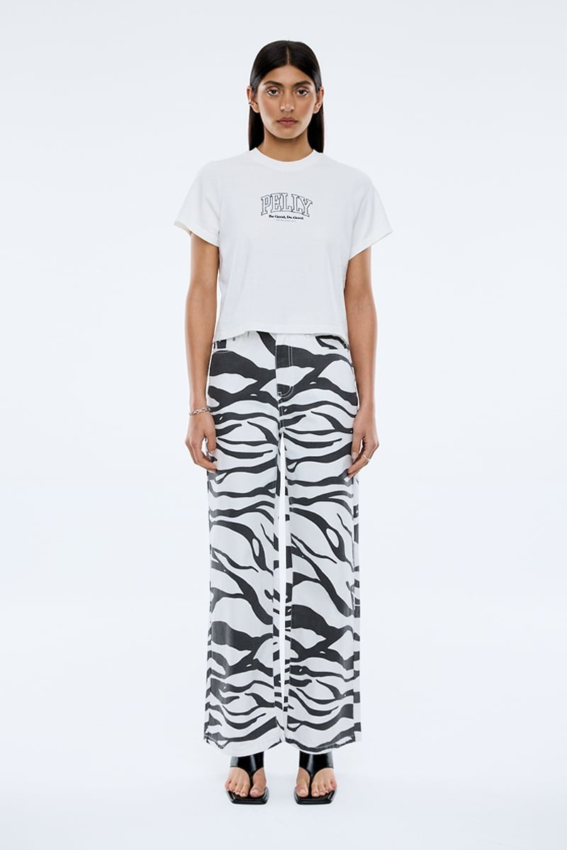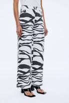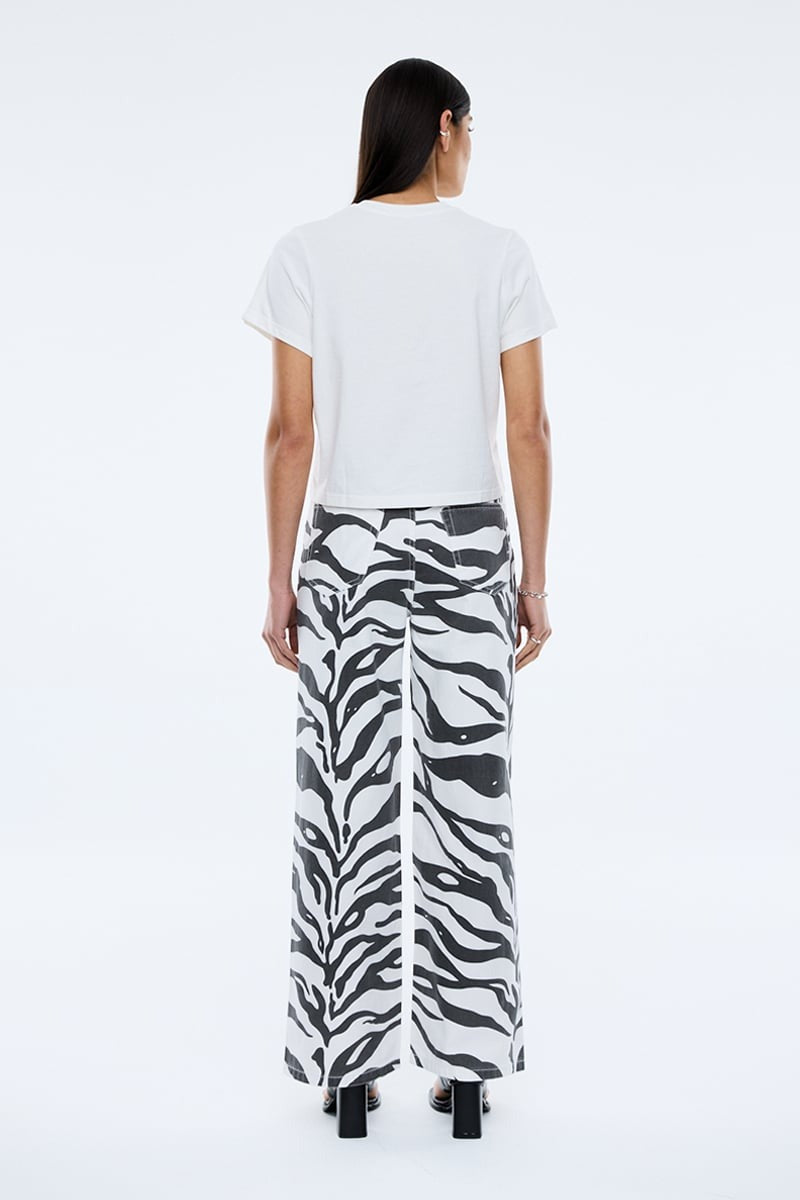 Make a statement in the Ena Pelly Lindy Relaxed Jean, a bold denim piece defined by its monochrome zebra print. Designed with a high-rise waist and relaxed, wide-leg fit, these jeans blend playful patterning with everyday versatility.