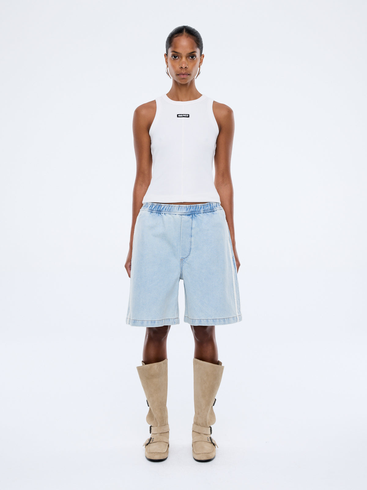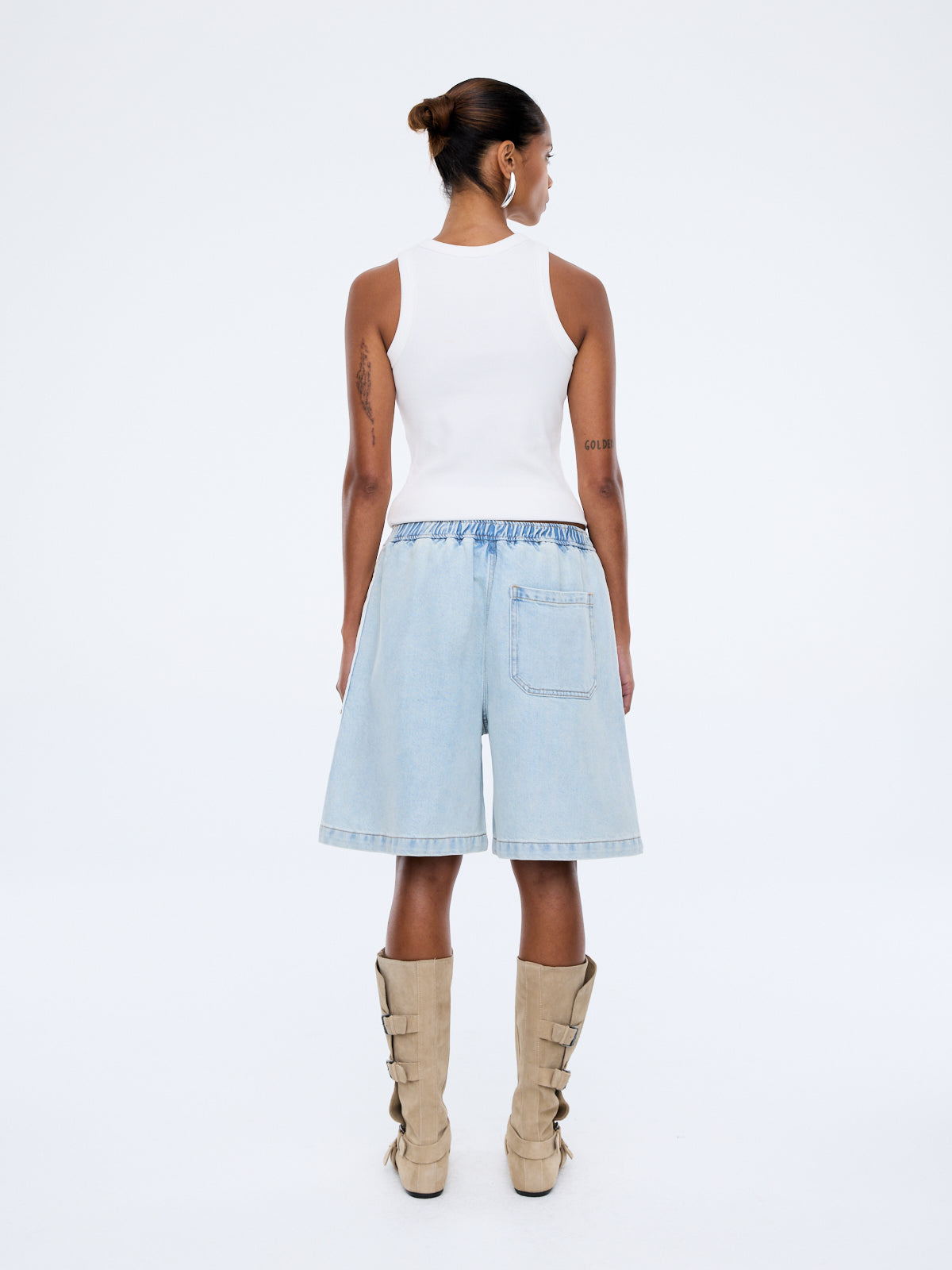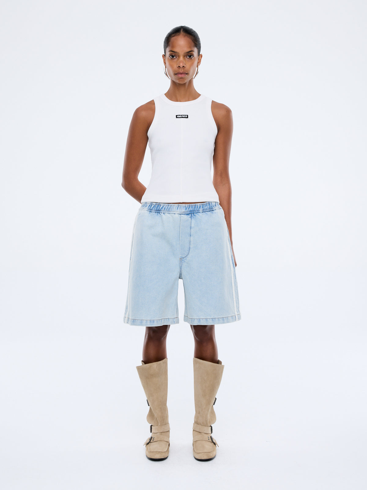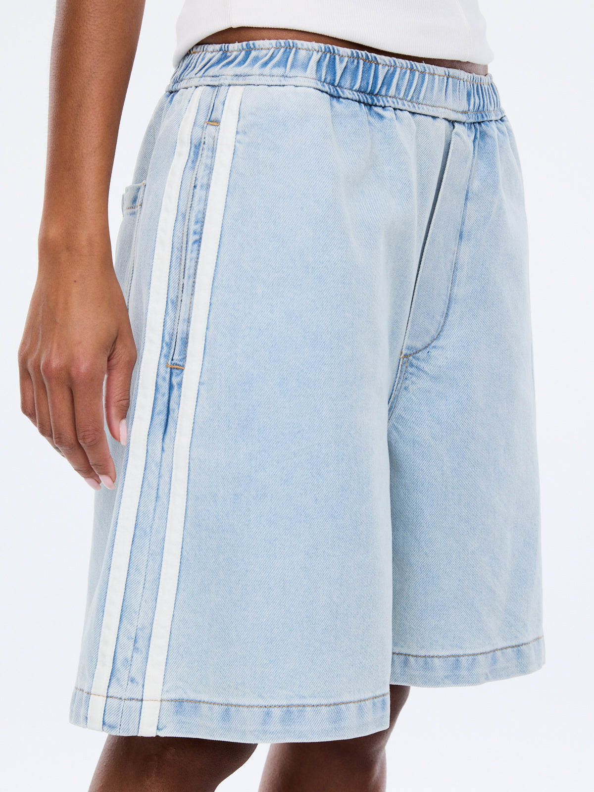 The Rosie Short is crafted from a cotton–lyocell blend denim in a light blue wash, cut to a relaxed pull-on shape that sits effortlessly on the waist. Detailed with zipped inseam pockets and contrast side stripes, bringing a soft structure to this jort-length piece.