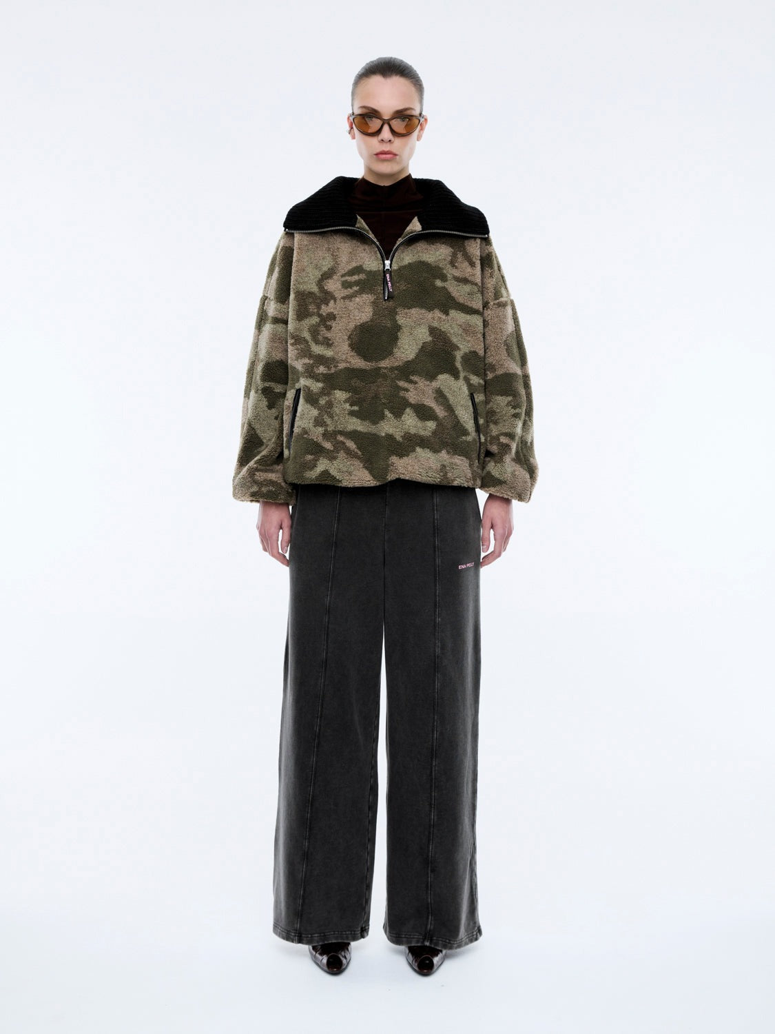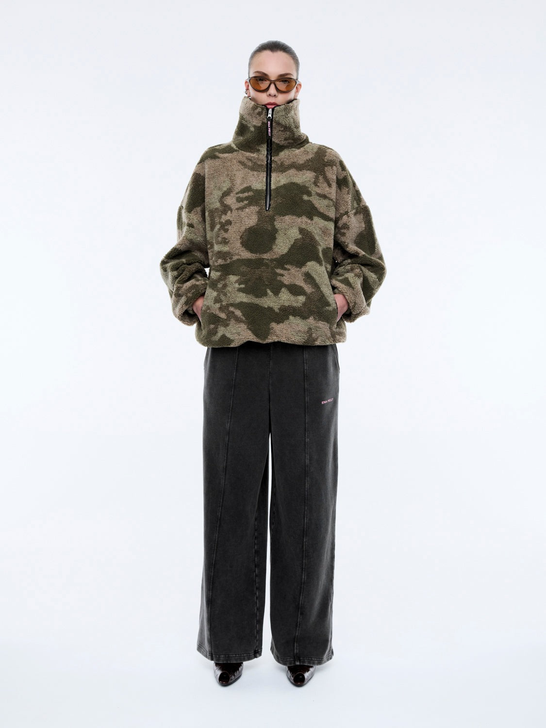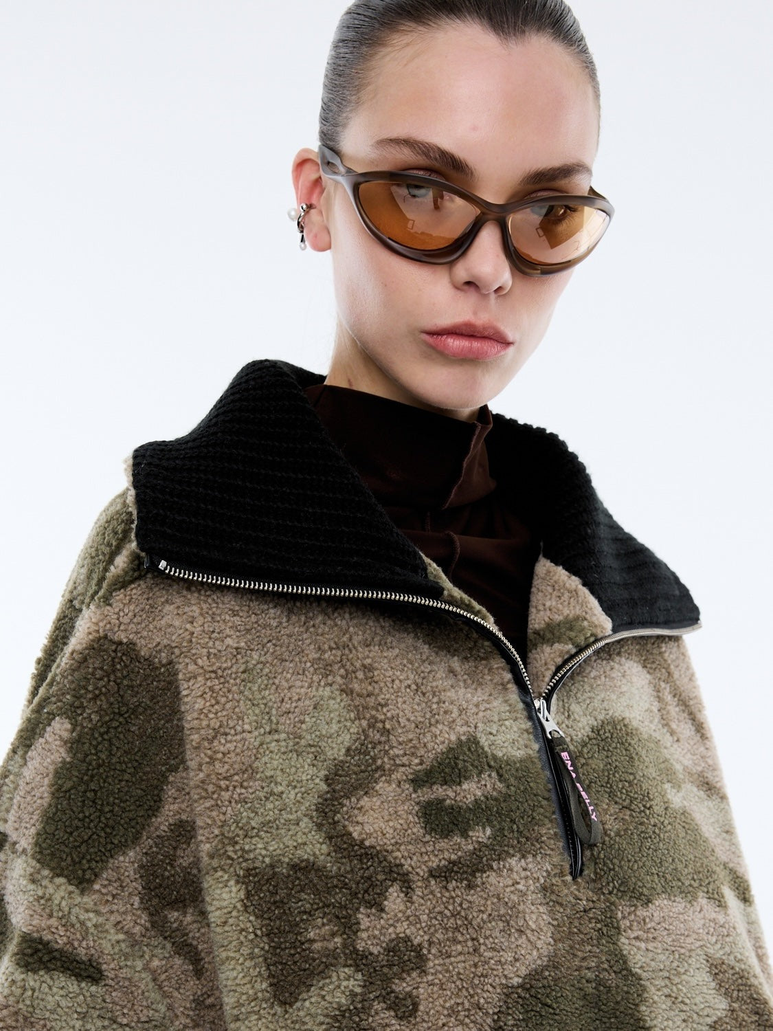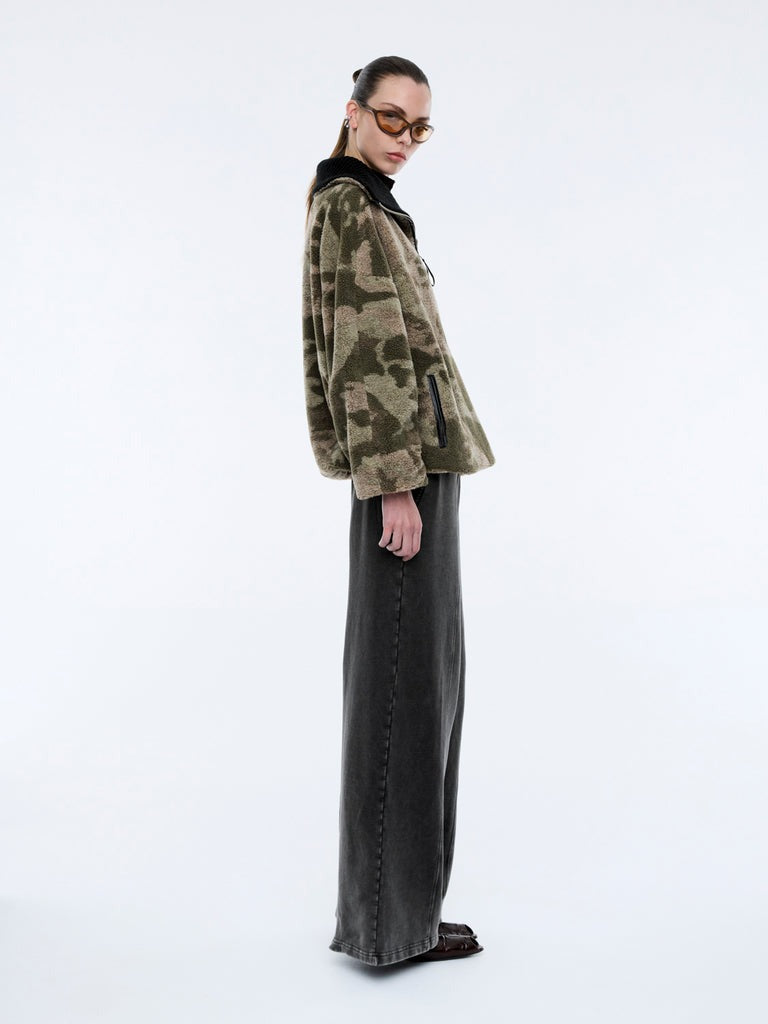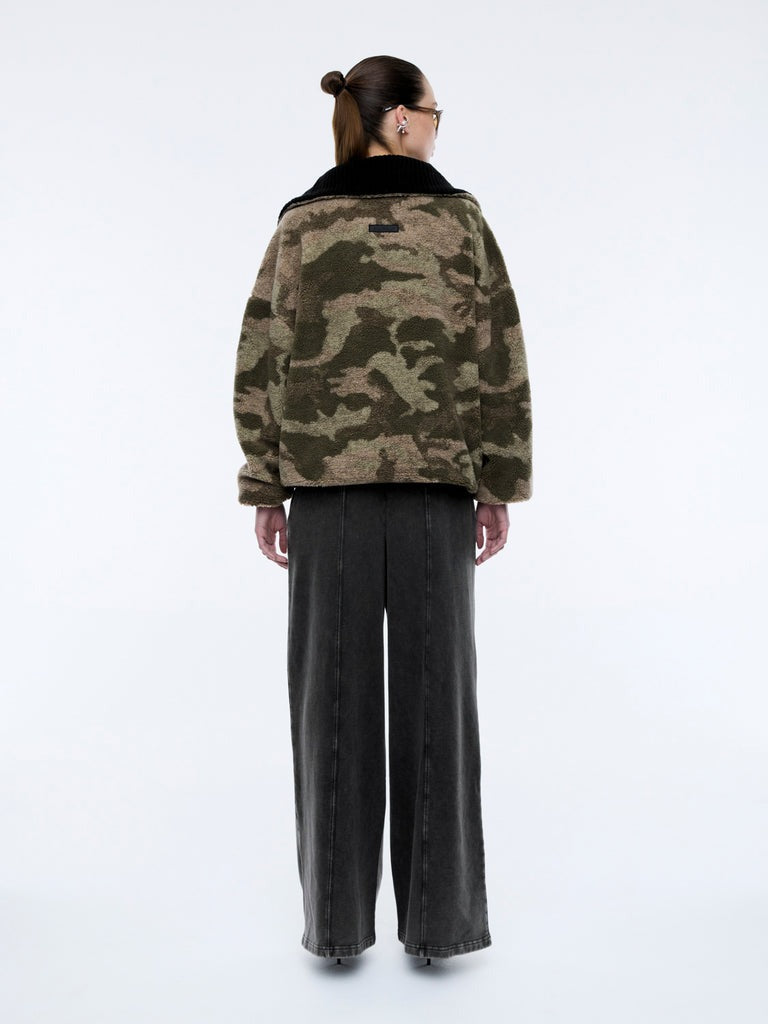 The Winnie 1/4 Zip Teddy is crafted with an oversized silhouette featuring a unique all-over camo yardage print, providing an effortlessly fashionable edge to any look. The adjustable hemline and drawcord toggle adds versatility, while the encased elastic sleeve hem ensures a polished touch.