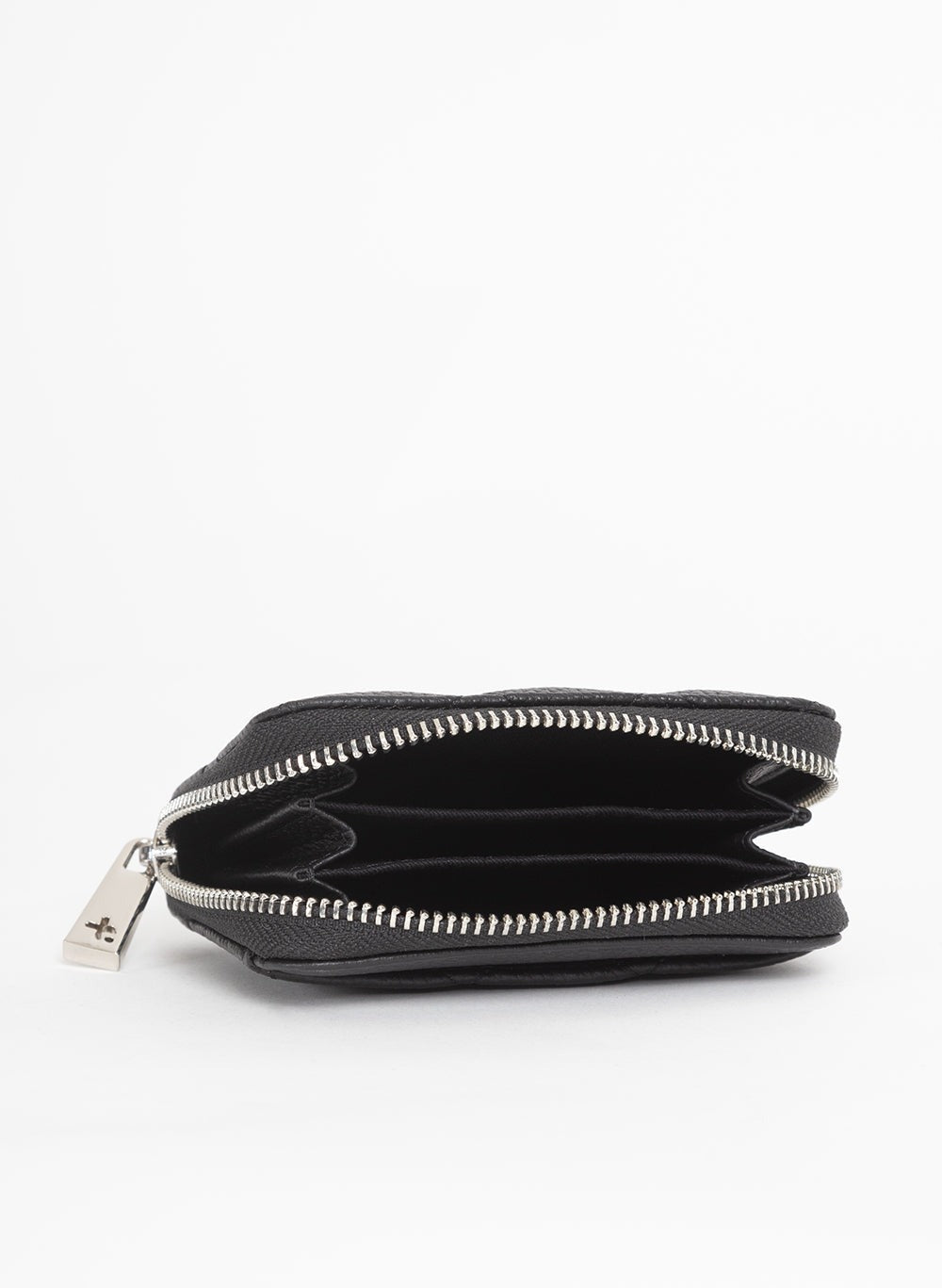 Keep your essentials tucked away in style with our For Wallet. Crafted from luxurious black leather with a chic quilted design, this compact wallet is both practical and effortlessly cool. It features a secure zip-around closure with a custom branded pull, opening to reveal three organized compartments for your cards and coins. Perfect for slipping into any bag or carrying on its own.