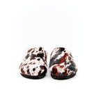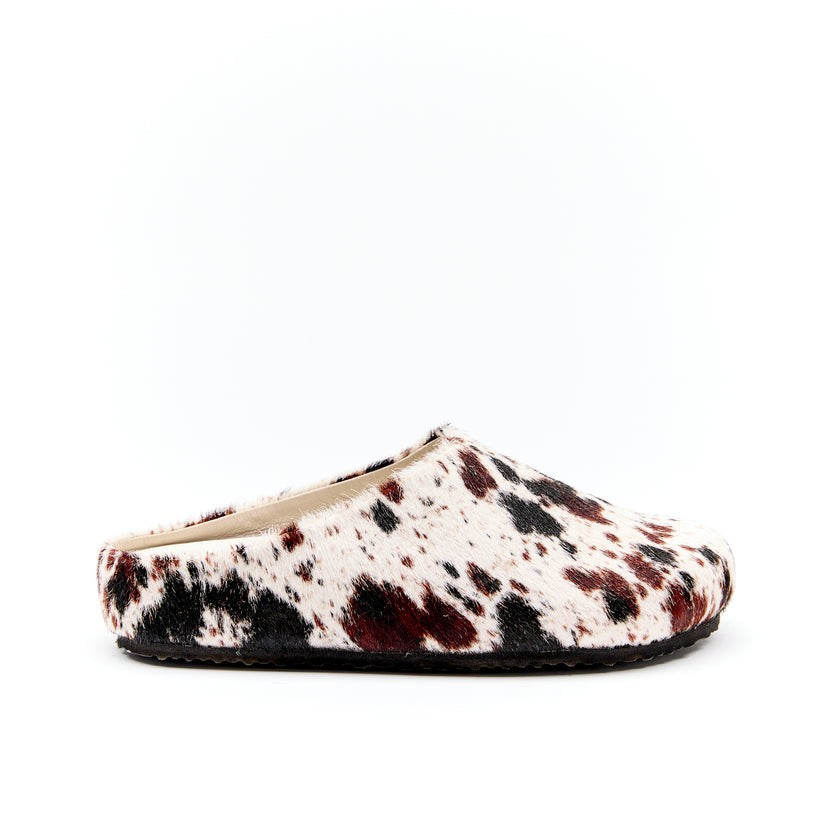 A bold take on evryday comfort, this slip-on mule features textured calf hair with a striking speckled pattern in ivory, deep brown and black.