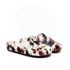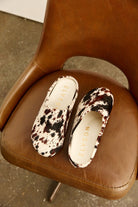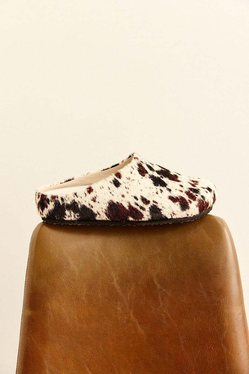 The organic cowhide-inspired print gives each pair a unique character, while the easy slip-on silhouette makes them effortlessly wearable.