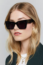 The Immortalised sunglasses in black feature a bold, squared-off cat-eye shape that commands attention. The glossy black bio-acetate frames are paired with smoke mono lenses, creating a sleek and versatile look. Finished with gold Karen Walker arrow hardware at the temples, these sunglasses embody unmistakable Karen Walker style.