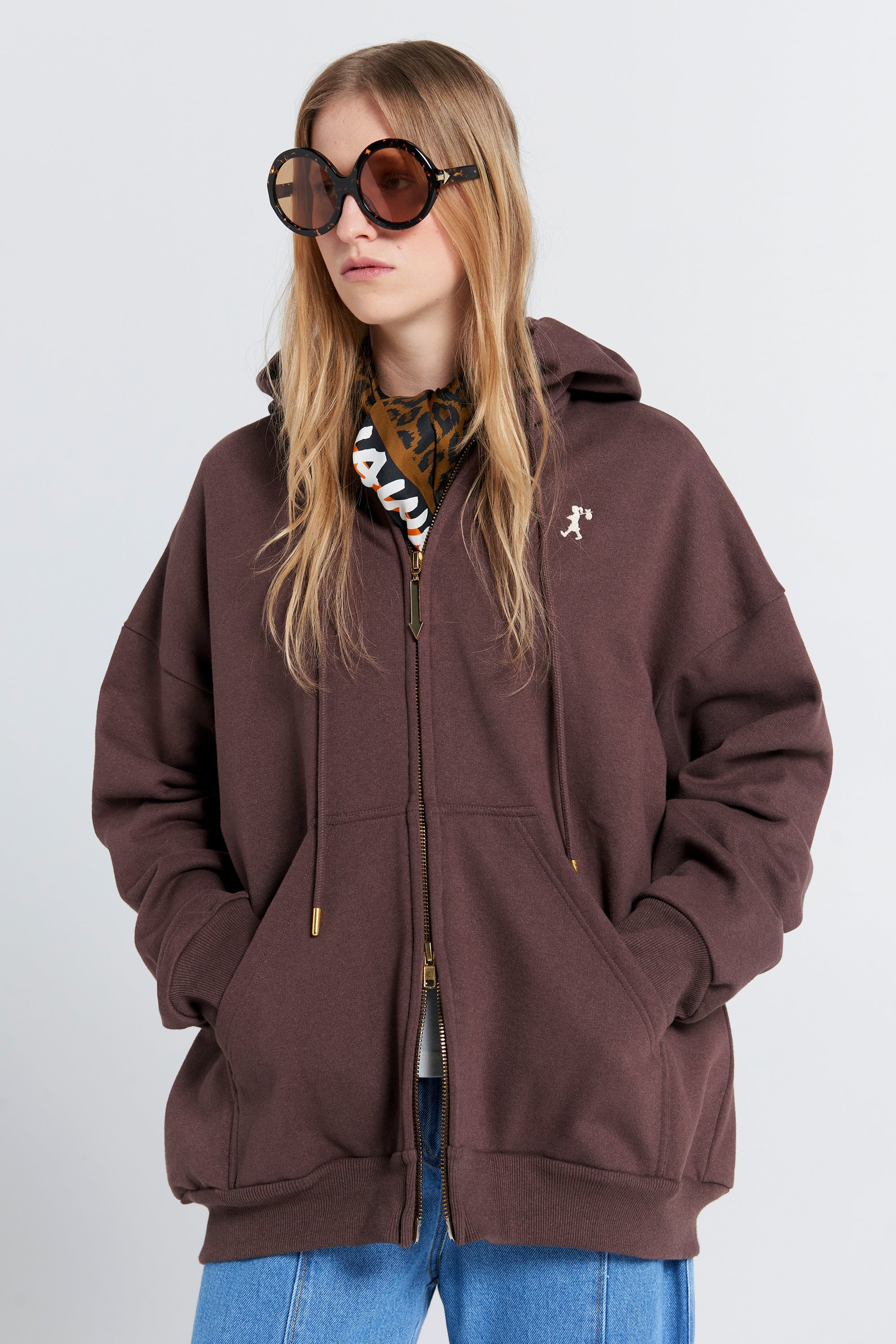 Designed for ease and comfort, this hoodie features a thick drawstring hood for chilly days and off-duty looks. Gold-tone metal details, the signature KW arrow double-ended zip, and Runaway Girl embroidery on the chest add a refined touch. The relaxed boxy fit creates an easy feel, while ribbed cuffs at the hem and sleeves ensure a neat finish.