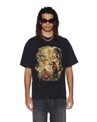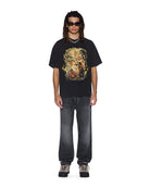 Boxy oversized fitting short sleeve t-shirt with a dropped shoulder and raw cut back hem. Detailed with a reversed overlocked side seam, signature rats tail and branded logos. Made from a premium 280gsm cotton jersey in acid black. Featuring seasonal artwork printed on the front and back. Finished with t-box and 4x4 embroidery branding.