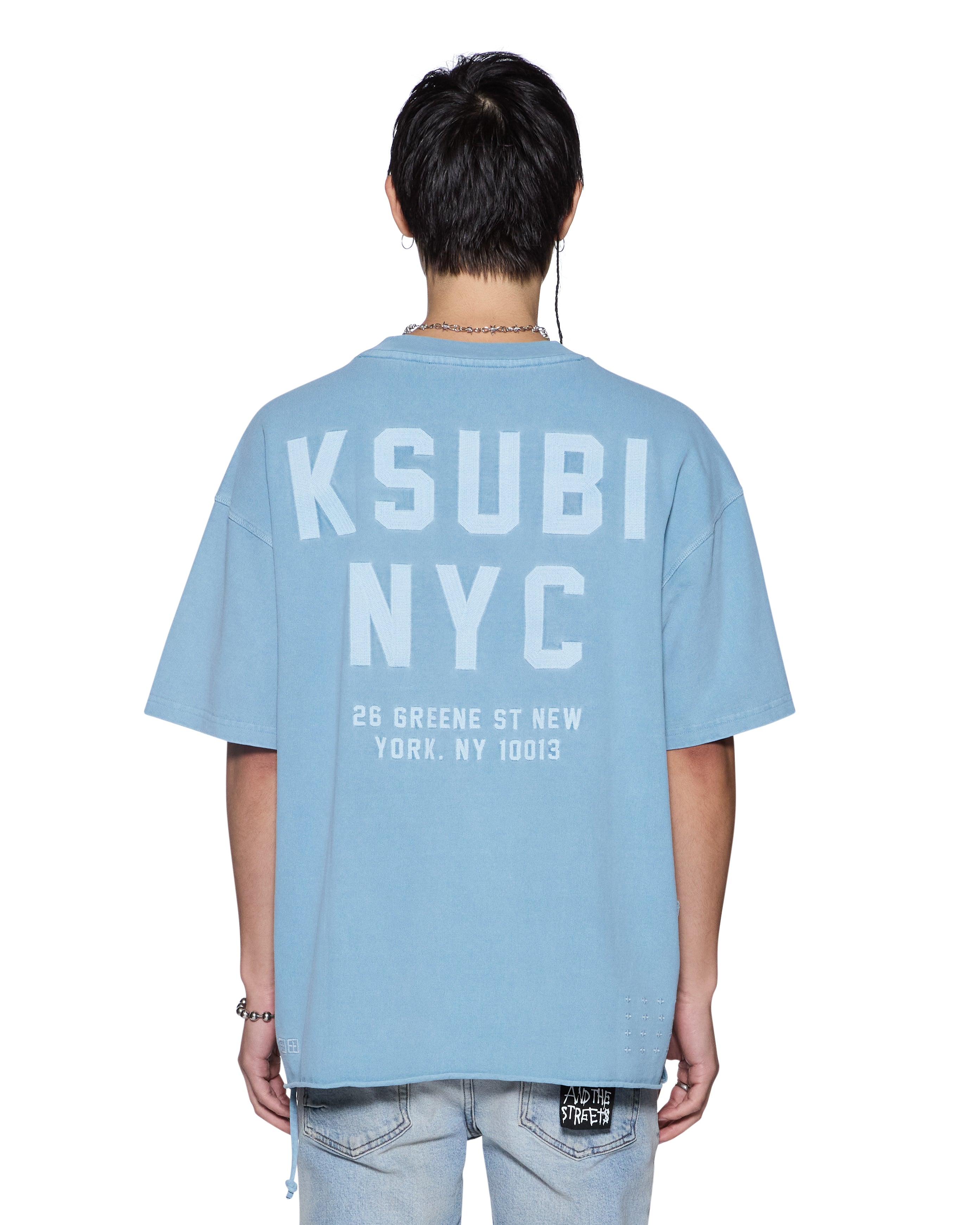 The K-Lock Biggie SS Tee Summer Blue is an oversized short sleeve t-shirt featuring a raw-cut back hem, reverse overlocked side seam, triangle rib neck inset and signature rats tail. Crafted from premium cotton jersey in a garment-dyed light blue with an aged wash, it showcases seasonal embroidery at the front and back and is finished with signature T-box and 4x4 branding.