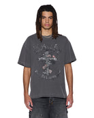 Boxy oversized fitting short sleeve t-shirt with a dropped shoulder and raw cut back hem. Detailed with a reversed overlocked side seam, signature rats tail and branded logos. Made from a premium 280gsm cotton jersey in acid black. Featuring seasonal artwork printed on the front and back. Finished with t-box and 4x4 embroidery branding.