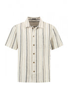 Crafted form a breathable linen blend, this short sleeve shirt features a natural base with vertical navy and taupe stripes for a clean, modern look.