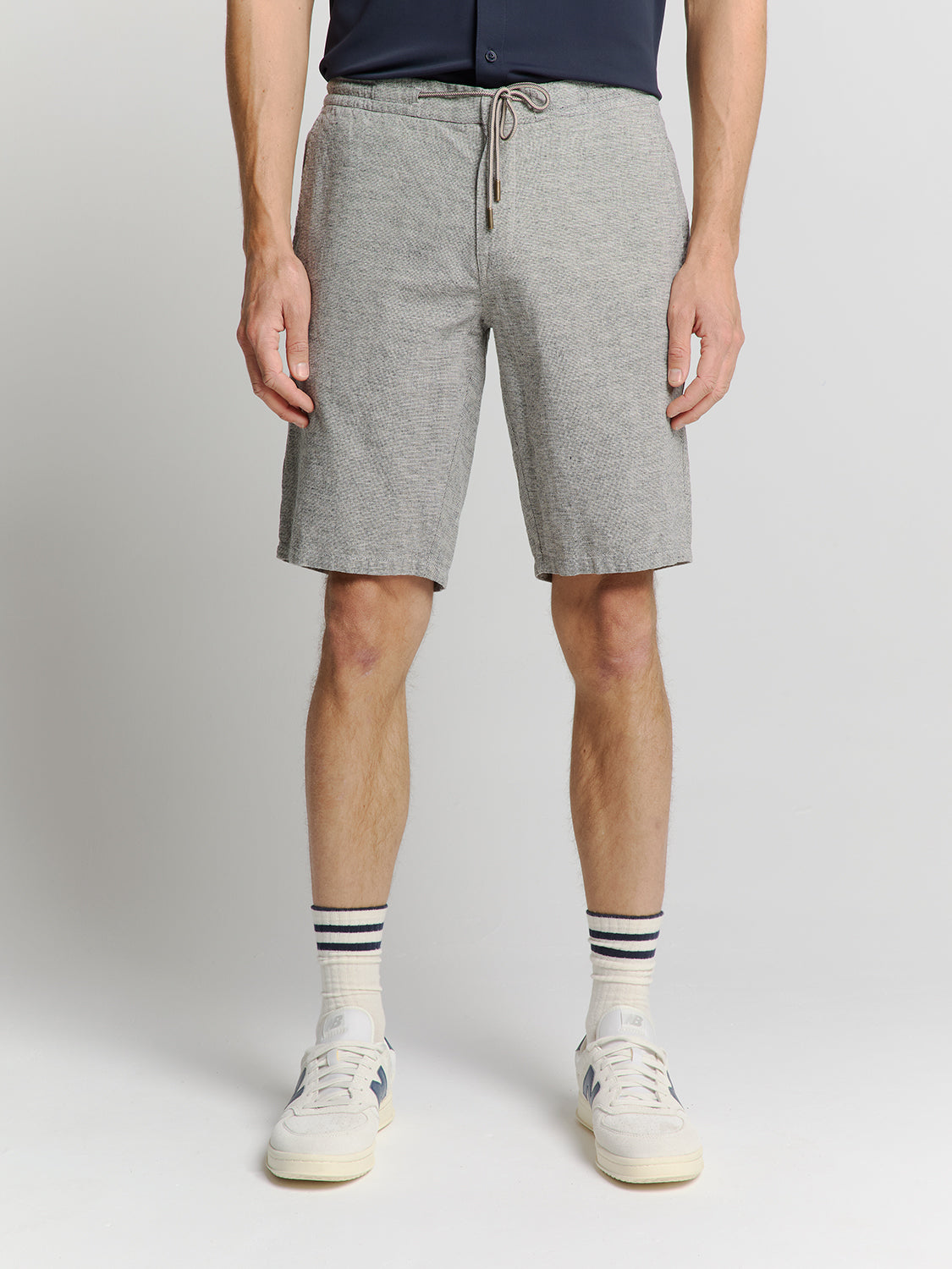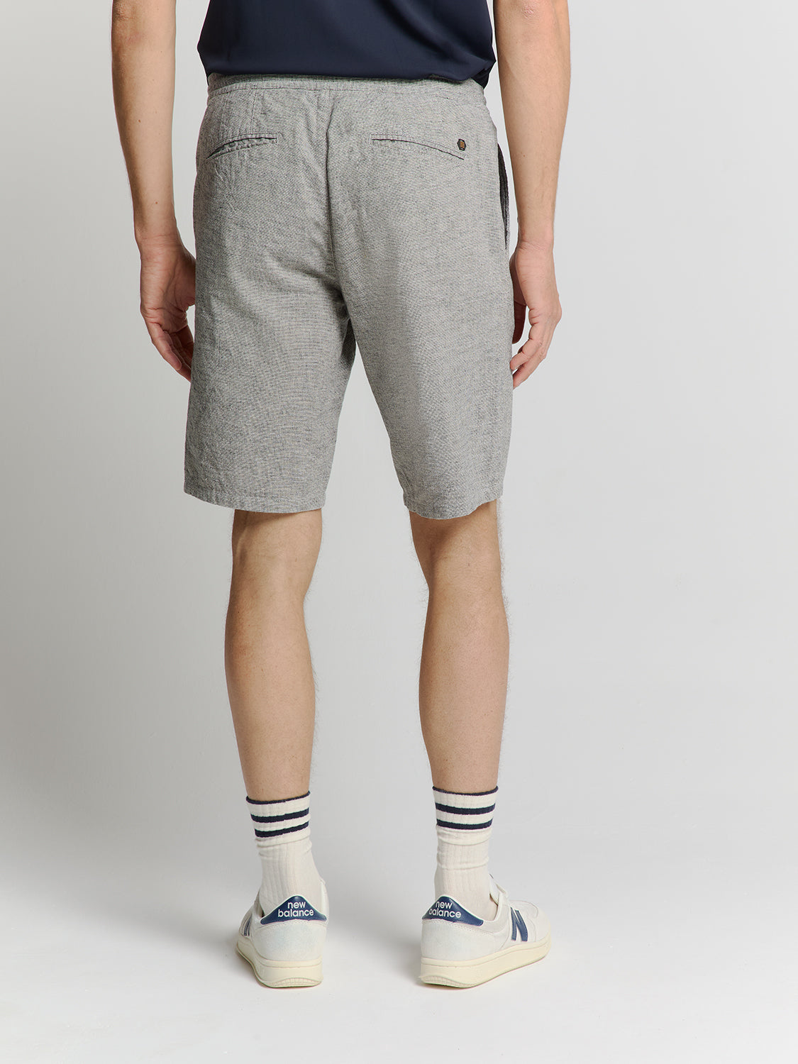Designed for effortless comfort, these blue linen blend shorts are the perfect balance of laid-back and refined. featuring a modern straight cut, adjustable drawstring waist and lightweight breathable fabric, they're ideal for warm weather dressing. The subtle texture adds a touch o sophistication, making them versatile enough for both casual days and smart-casual evenings.