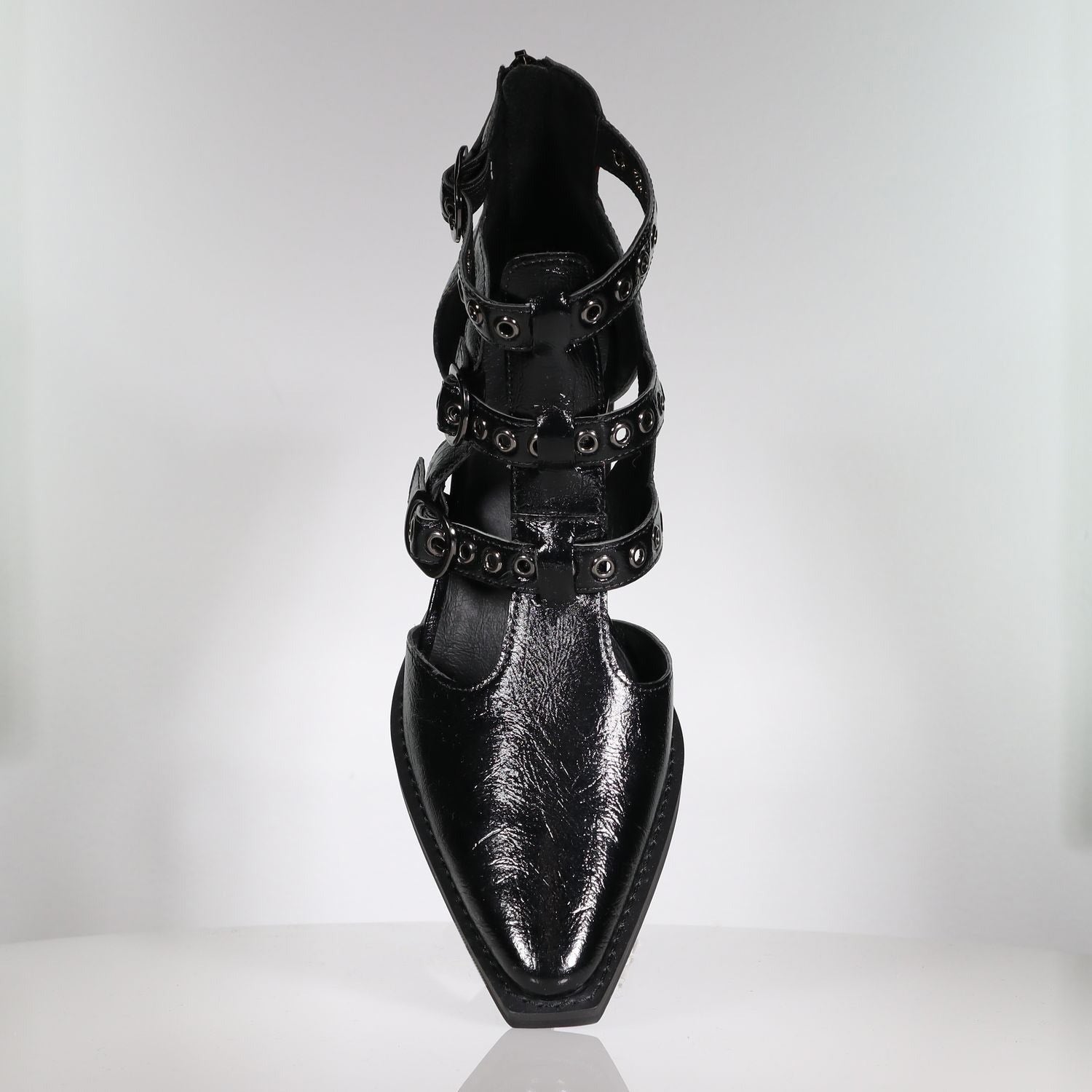 Its striking upper features eyeleted statement straps across the front with adjustable buckles to suit a variety of foot shapes, plus a back zip for easy on and off. Designed with a square round toe and stacked Cuban wood heel, Skyler brings runway-ready drama in every step. It’s the perfect power move for styling with denim, dresses, or sharp tailoring.