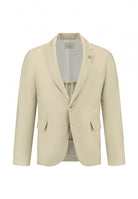 This tailored blazer in a light sand tone, offering a refined balance bewteen casual sophistication and modern minimalism. Cut in a single breasted silhouette, it features notch lapels, a two button front closure and flap pockets that lend a clean, structured look. A subtle lapel pin detail adds a hint of personality and polish.