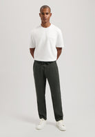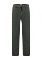 Mens drawstring trousers in a dark khaki tone, combiningj tailored sophistication with relaxed ease. Crafted from a lightweight linen blend fabric, these pants offer natural breathability, a smooth texture and a softly structured drape ideal for warm weather wear.
