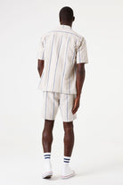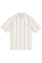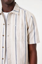 This short sleeve shirt features a clean vertical stipe pattern in stone and navy tones adding subtle texture adn contrast.