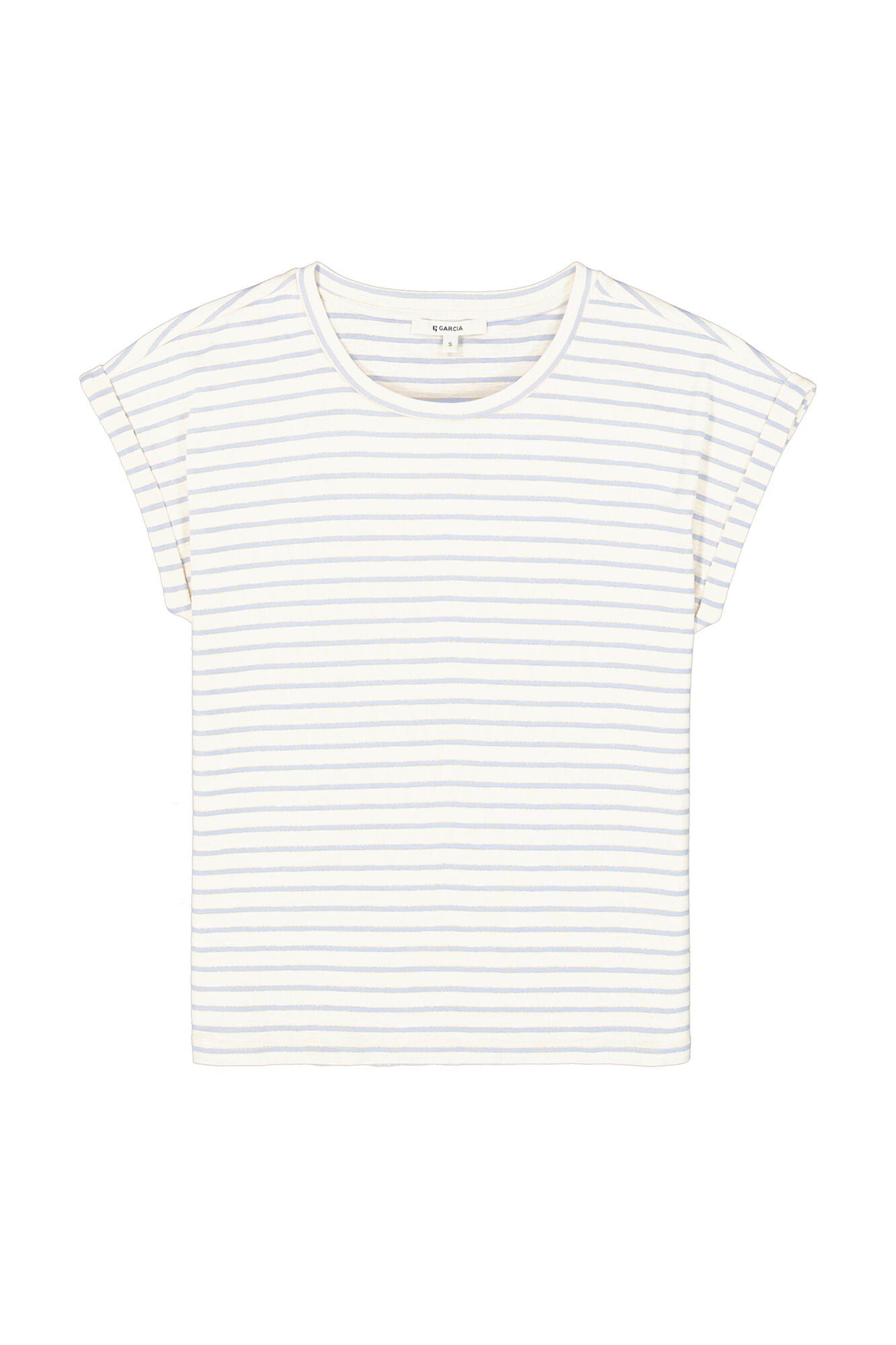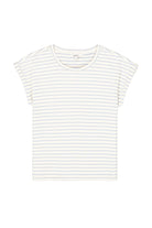 A timeless essential with a fresh coastal feel, this striped tee features soft blue and white horizontal stripes on a creamy base.