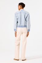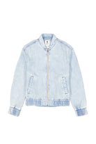 This light wash bomber jacket blends casual streetwear with a timeless, laid-back appeal. Crafted from soft, faded cotton denim, it features a zip front closure, ribbed hem and cuffs and angled side pockets for a relaxed yet structured silhouette.