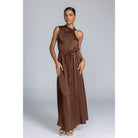 The Leonie Dress is pure evening allure — designed to turn heads with its lustrous drape and refined detailing. Crafted from rich brandy brown viscose satin, it shimmers softly with every movement. The asymmetrical halter neckline frames the shoulders with elegance, while the back with bow-tie detail and deep keyhole creates a striking impression. Cinched at the waist with a delicate self-tie belt, the silhouette cascades into a floor-grazing skirt with fluid side splits — effortless sophistication for any event.