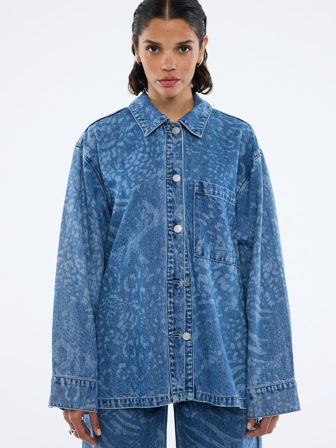 The Lisa Denim Shirt is cut oversized in soft, draped denim with a blue mixed animal print.