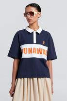 Crafted from organic cotton, the Runaway Rugby Jersey combines vintage sport influences with a contemporary, boxy t-shirt fit. The jersey features a classic rugby collar and is finished with KW details: an embroidered Runaway Girl in vibrant orange, and the Runaway slogan in the same bold shade. This piece strikes the perfect balance between collegiate tradition and everyday play.