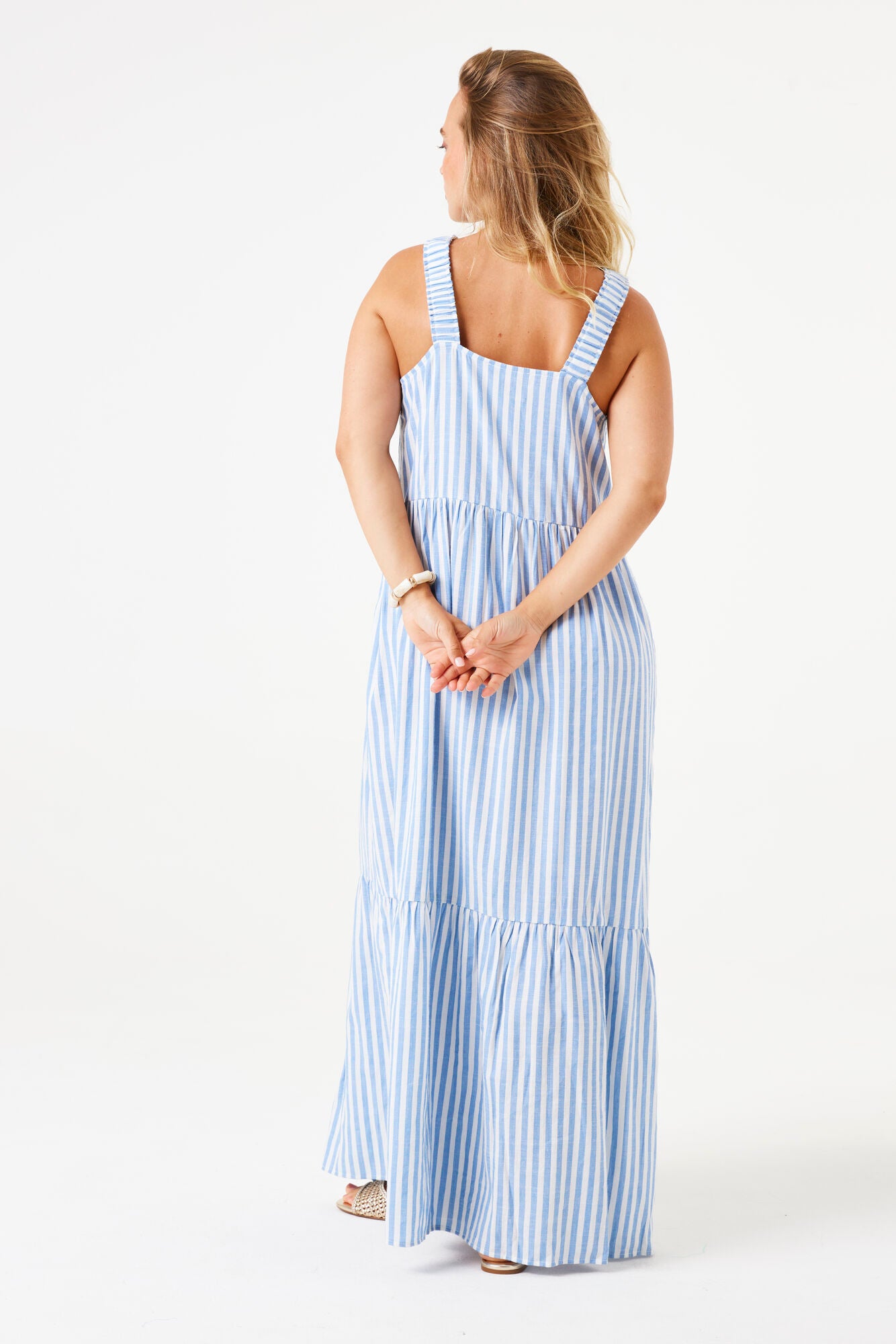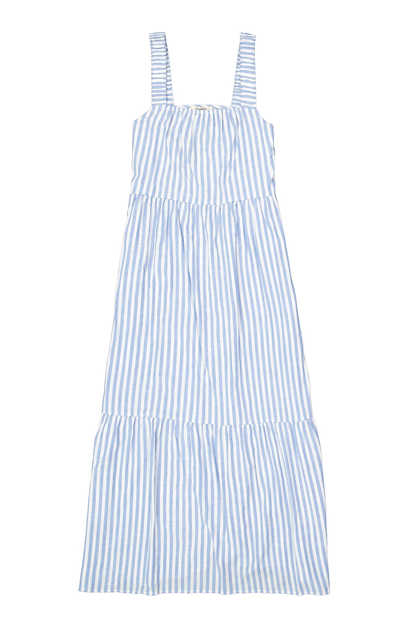 Featuring classic blue and white vertical stripes, its designed with wide shoulder straps, a softly gathered bodice and a tiered skirt that flows effortlessly for a relaxed, feminine silhouette.