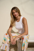 Vibrant, easy and full of personality the Travel tropical postcard pant brings holiday-ready joy to your everyday wardrobe. Designed with a flattering high-rise fit and effortless pull-on style, these pants feature a soft elastic waist for all-day comfort. Crafted from a breezy viscose-nylon blend and adorned with playful postcard prints, they make relaxed dressing fun and carefree. Perfect for pairing with a tank or shirt for instant high-low style.