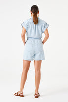 The matching fabric belt cinches the waist for a flattering fit, while the tailored seams and short length add a playful, modern edge.