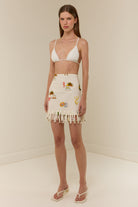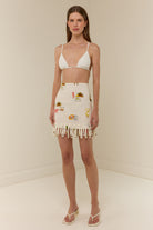 The Tropicana Skirt in our exclusive Tropicana print is a new mini skirt crafted from a premium Linen blend. The Tropicana skirt is designed to be a straight silhouette featuring a double layer knotted tassel for a fun but elevated finish. Pair back with our Alto shirt for a matching set.