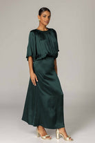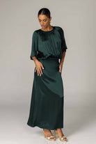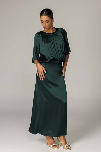 Crafted from luxurious Rayon Viscose Satin, the Euphoria Dress in Olive boasts a high round neck-band and bodice gathered off the neckline and waist. The back bodice features a beautiful button-through design with a thick tie at the waist, while the short flutter sleeves add a touch of elegance. The maxi length skirt is cut on the bias for a flattering silhouette, and the top of the back skirt is elasticated for comfort and ease. Elevate any occasion with this exclusive and tasteful piece.