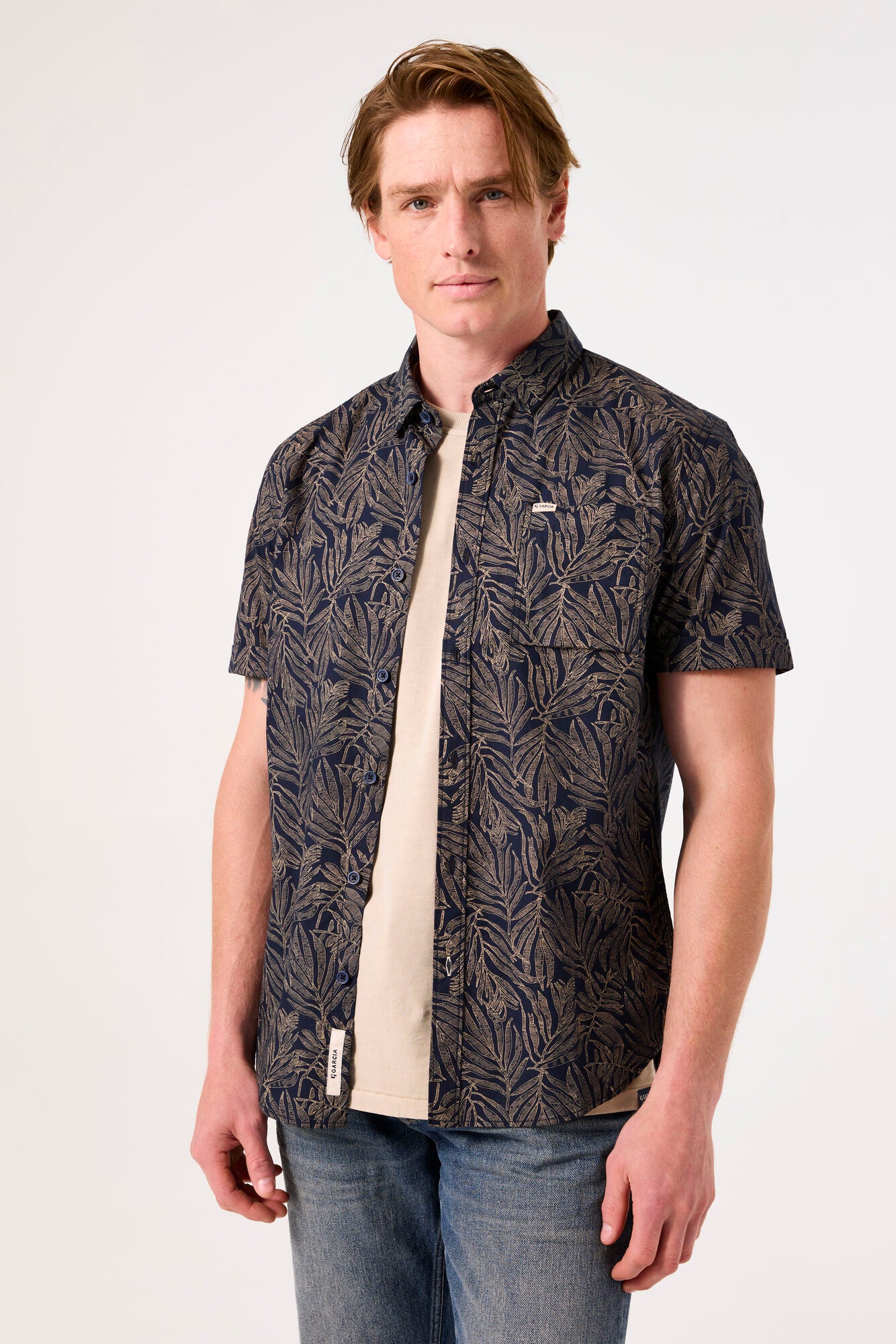 Make a statement in this bold short sleeve shirt featuring an allover boatanical leaf print.