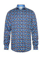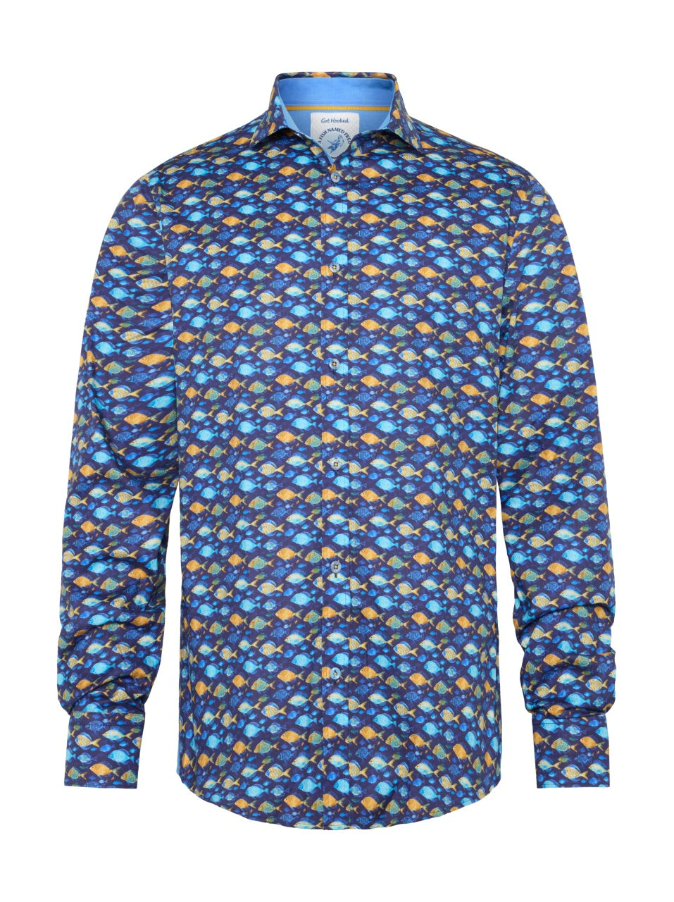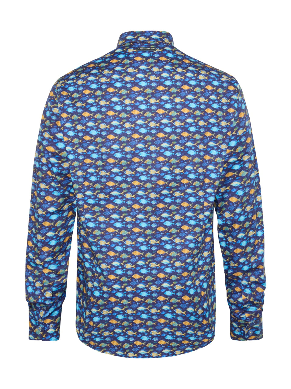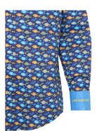 Make a splash with this vibrant long sleeve shirt featuring an allover tropical fish print.