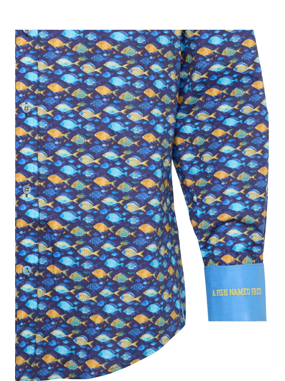 Set on a deep navy background, the design showcases a lively school of fish in electric shades of blue, yellow and orange - a playful nod to underwater adventure.