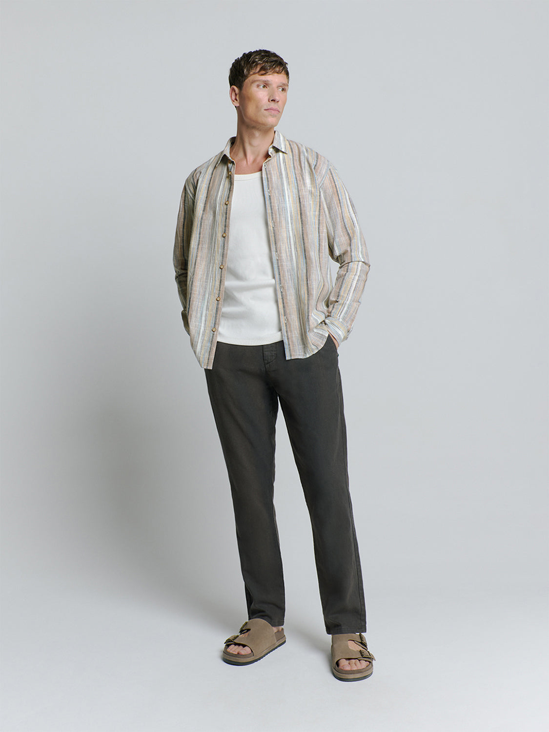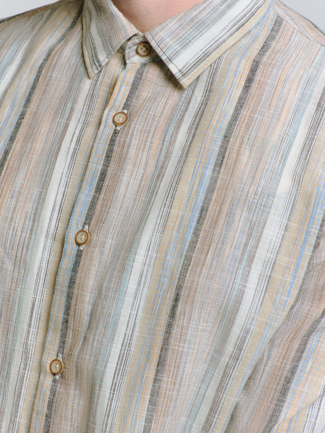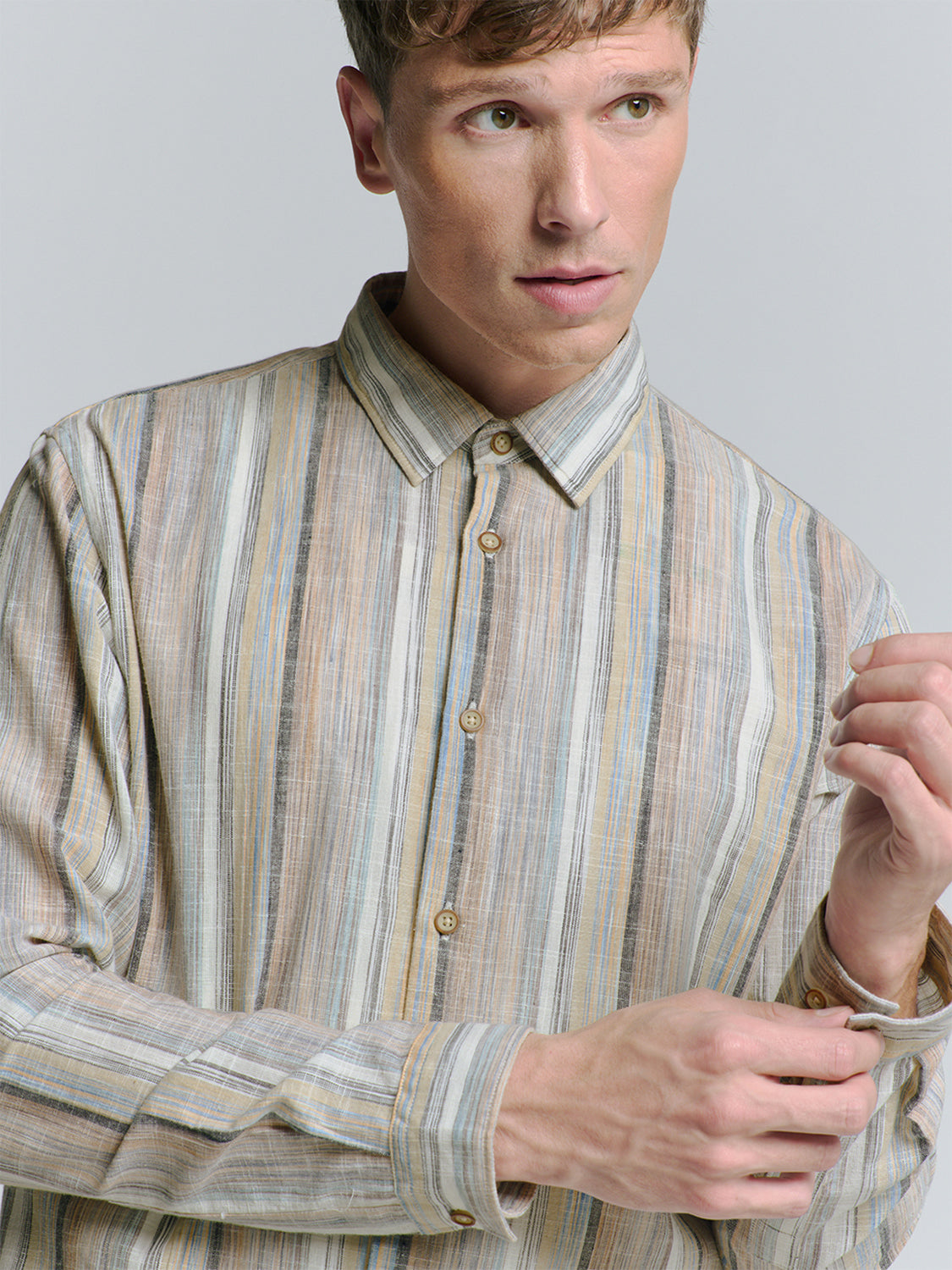 This lightweight long sleeve shirt is defined by its vertical stripes in muted earthy and cool tones, creating a look thats both refined and relaxed. Crafted from breathable fabric, its ideal for all-day wear, whether layered under a blazer for a polished edge or styled casually with rolled up sleeves.