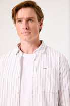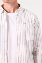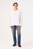 Effortlessly refined, this long sleeve shirt is crafted form a breathable linen cotton blend for a light, easy feel. The srips white base is elevated with evenly spaced soft blue pinstripes, lending a timeless yet modern edge.