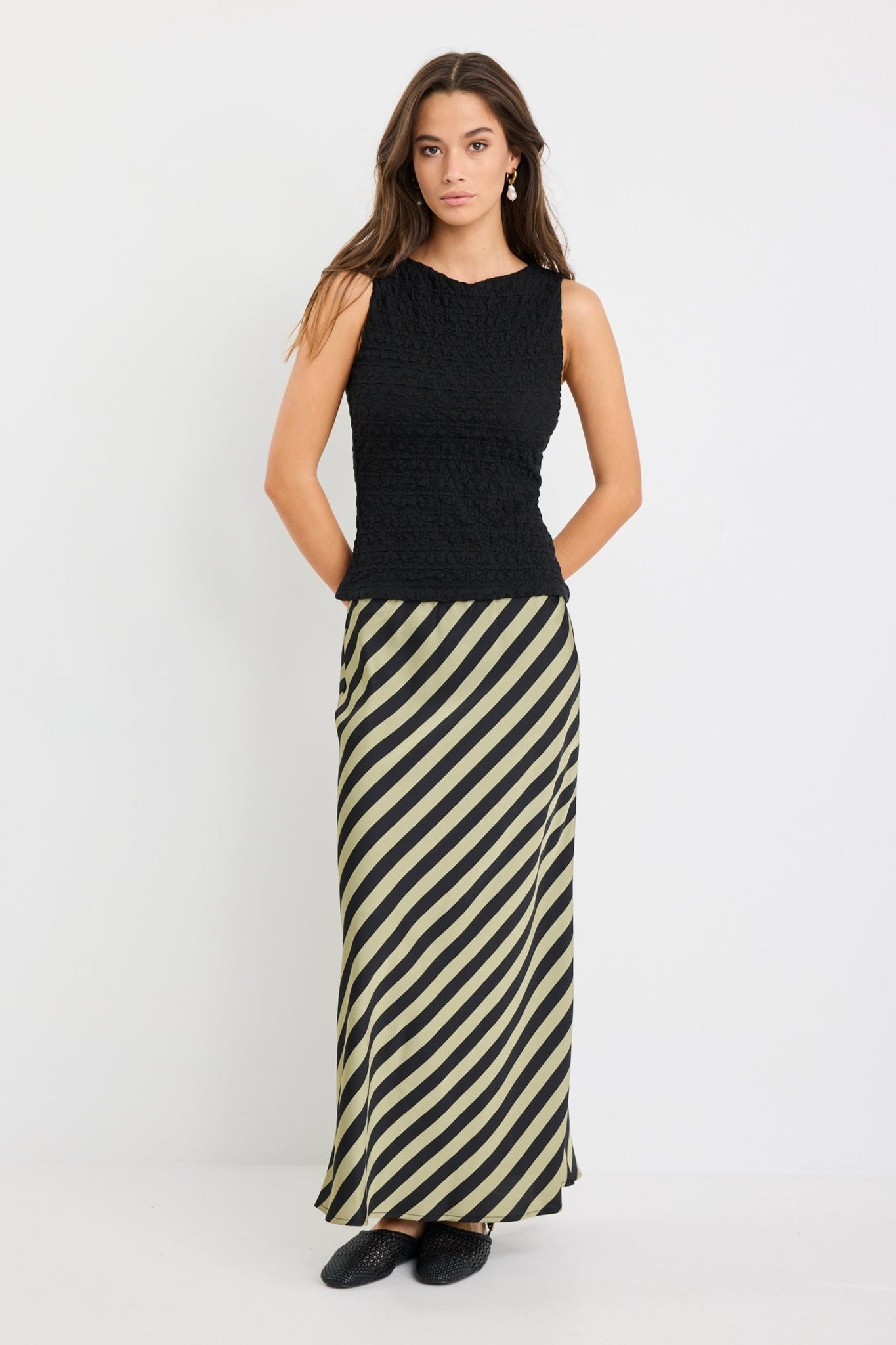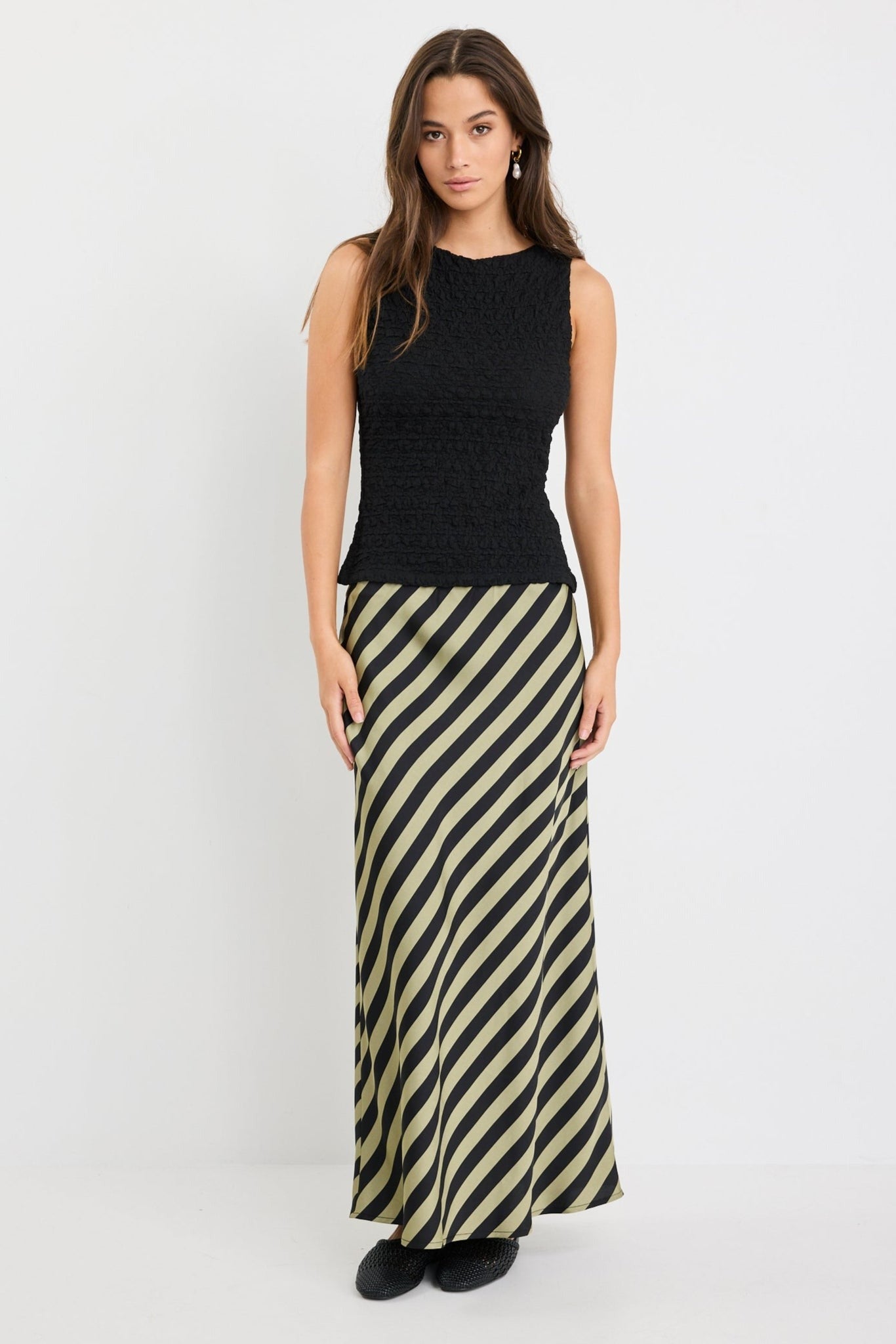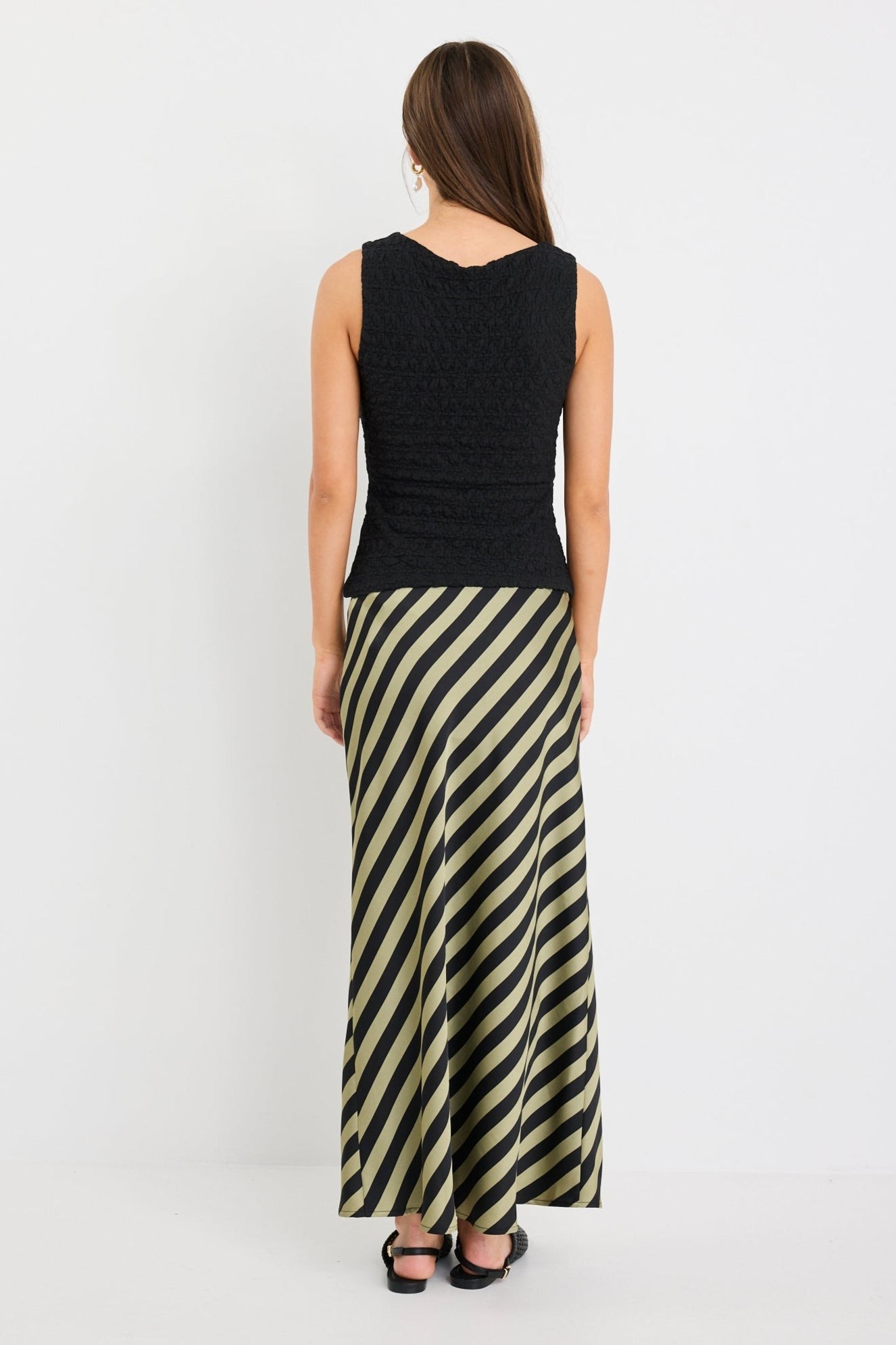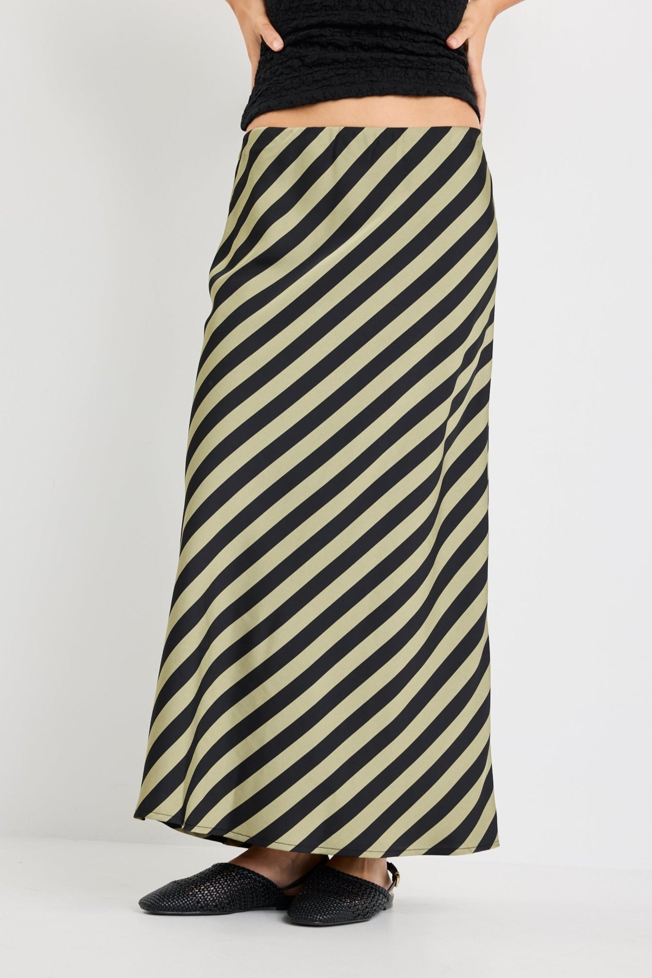 Stunning Stripe Satin Bias Midi Skirt - Khaki Black Stripe