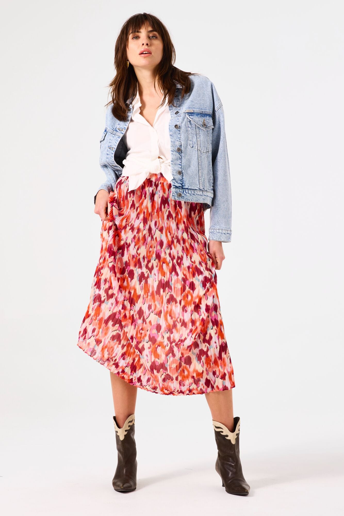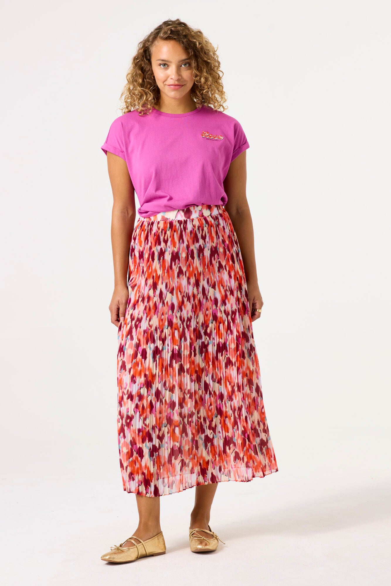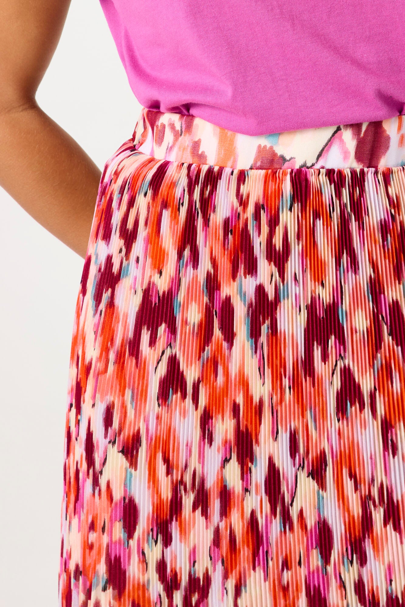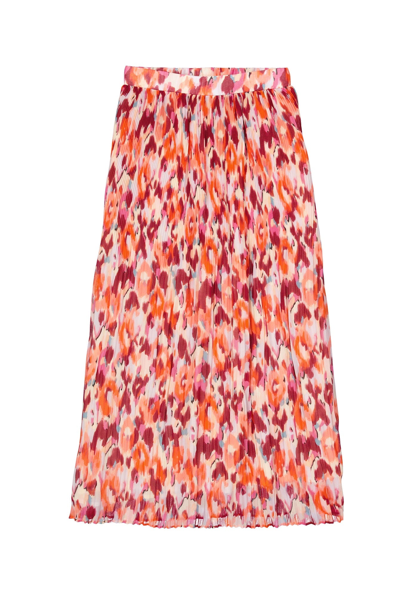 This pleated mini skirt features a vibrant abstract loral print in tones of coral, pink, orange and white.  Crafted form a lightweight, flowy fabric, it drapes beautifully with soft pleats that create movement and dimension.