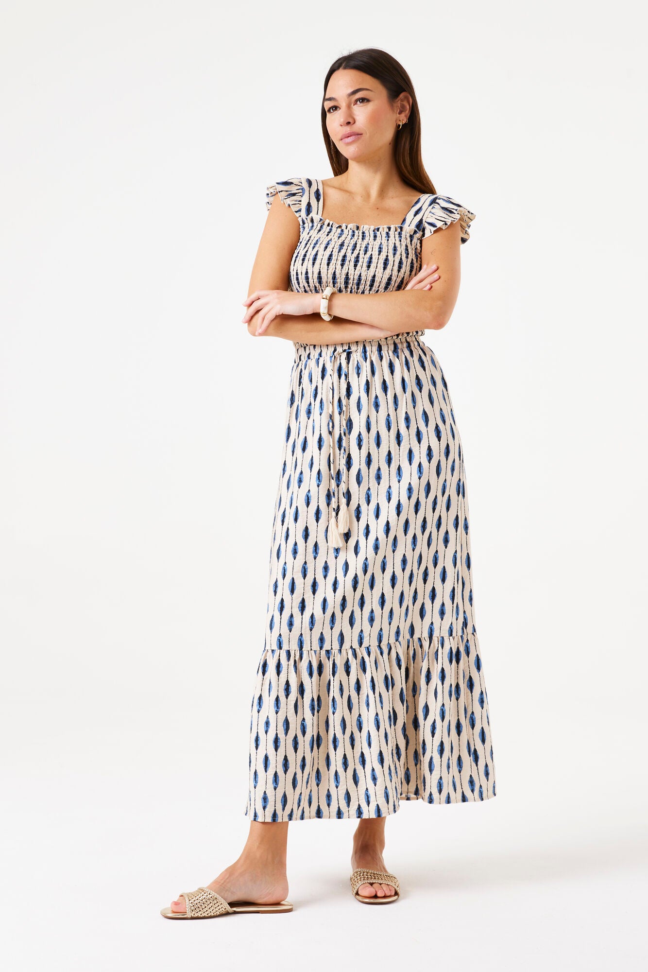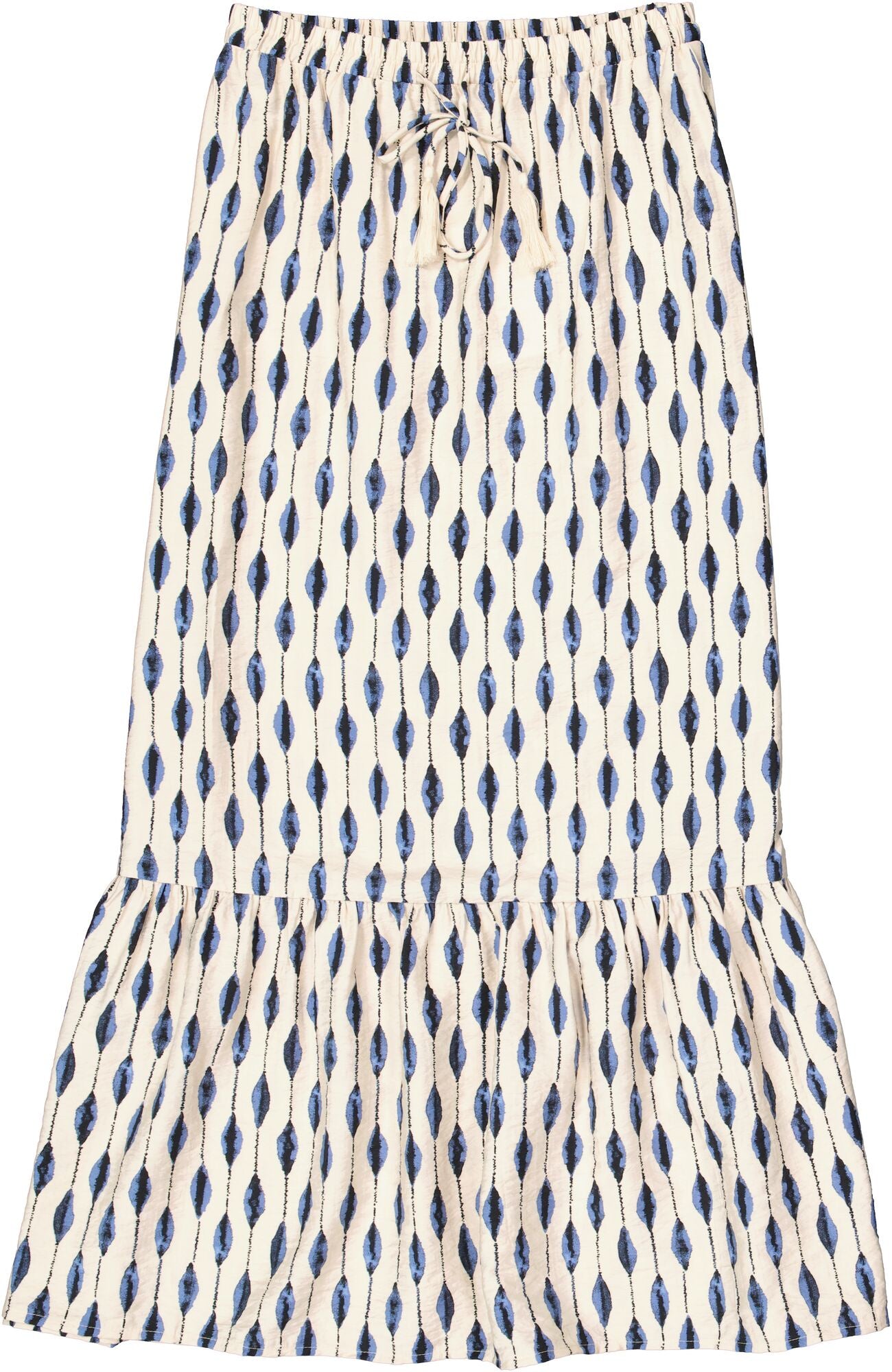 Effortlessly feminine, this Garcia printed maxi skirt features a soft cream base with a striking blue ikat-inspired pattern that adds a touch of bohemian charm.