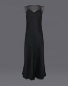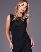 Cut to a bias-cut silhouette, this flattering slip dress features a rounded neckline and sleeveless silhouette with front and back mesh neckline panelling.