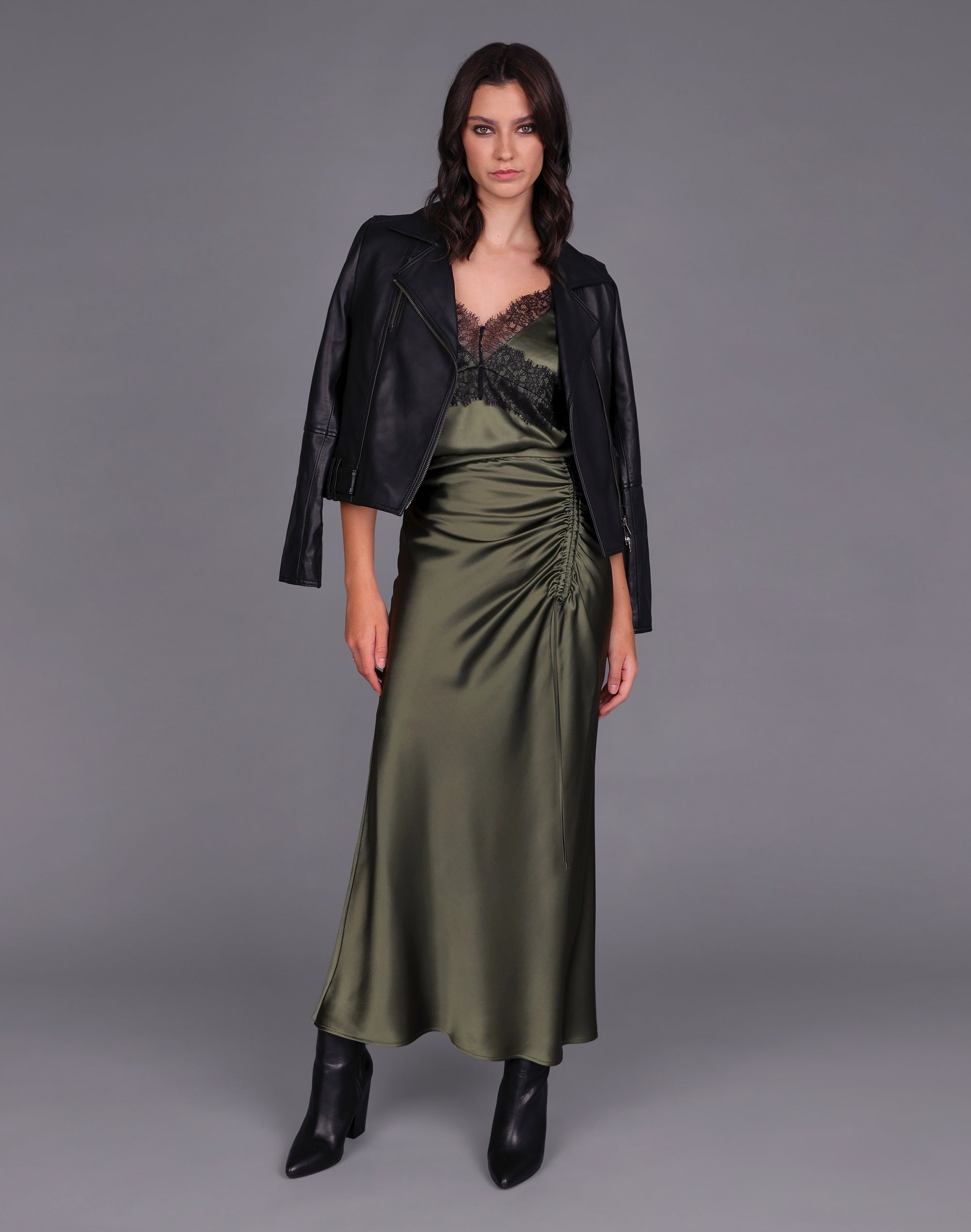 This stunning skirt features an adjustable side ruched detail, invisible back zip, and a midi hem length.
