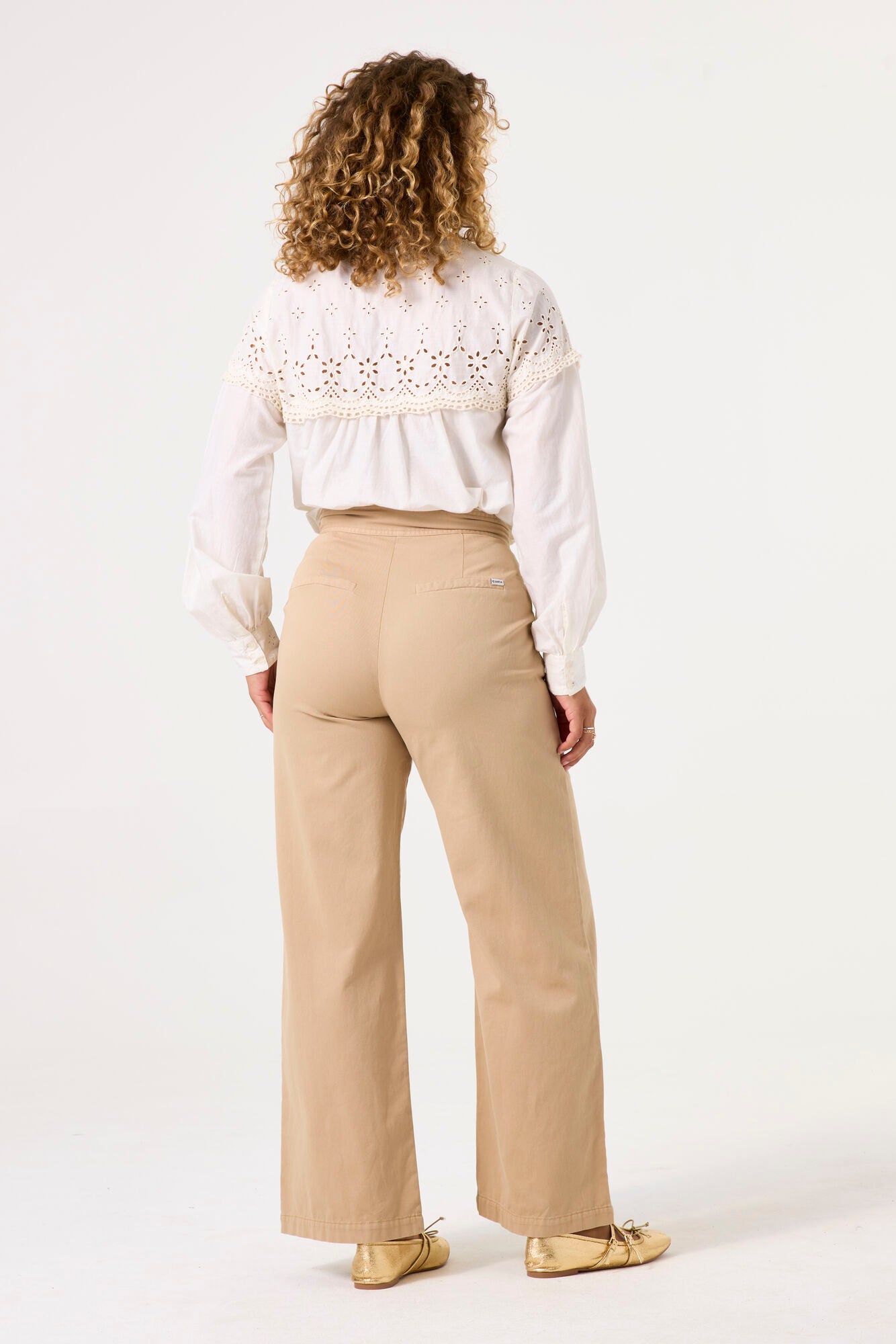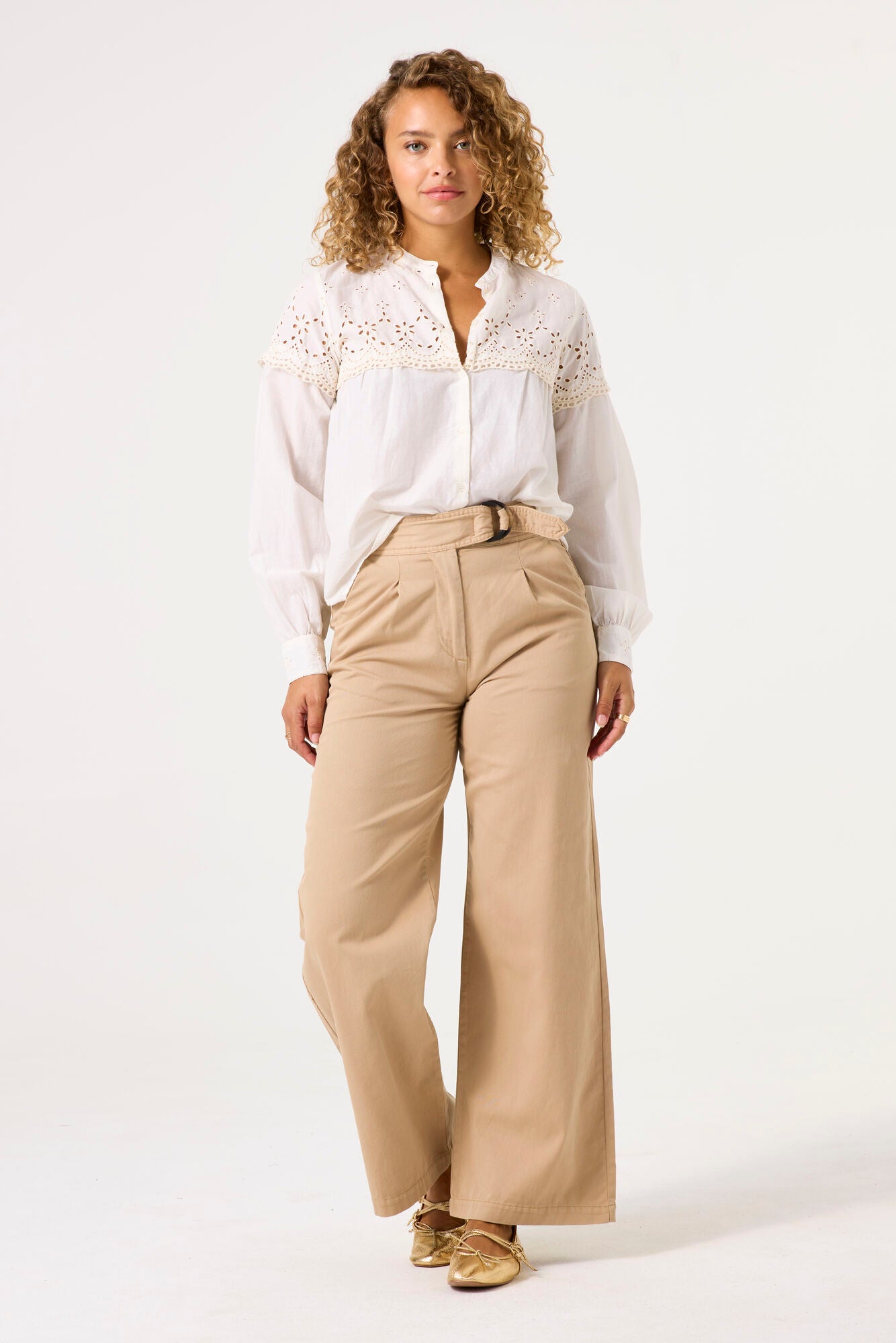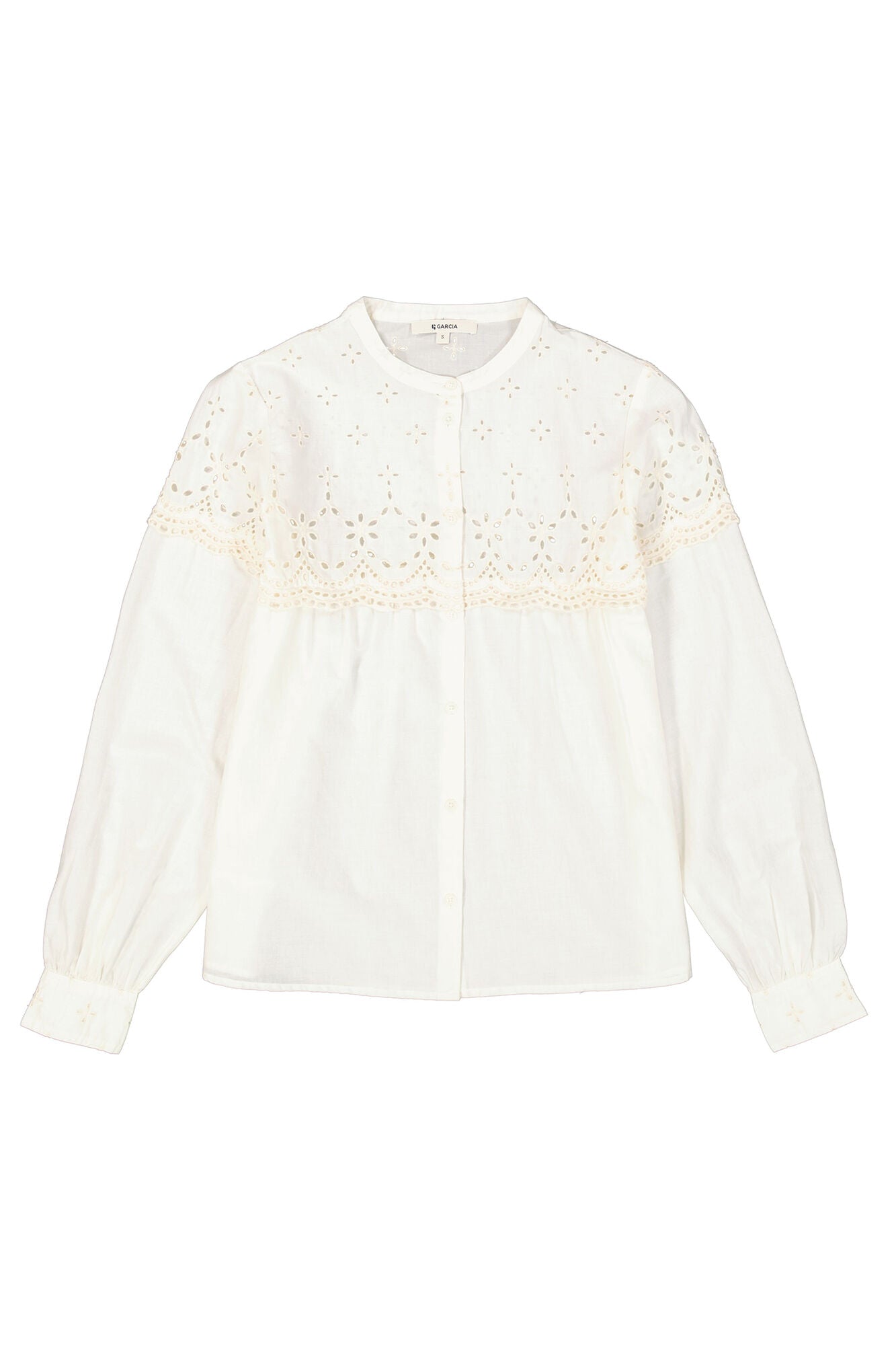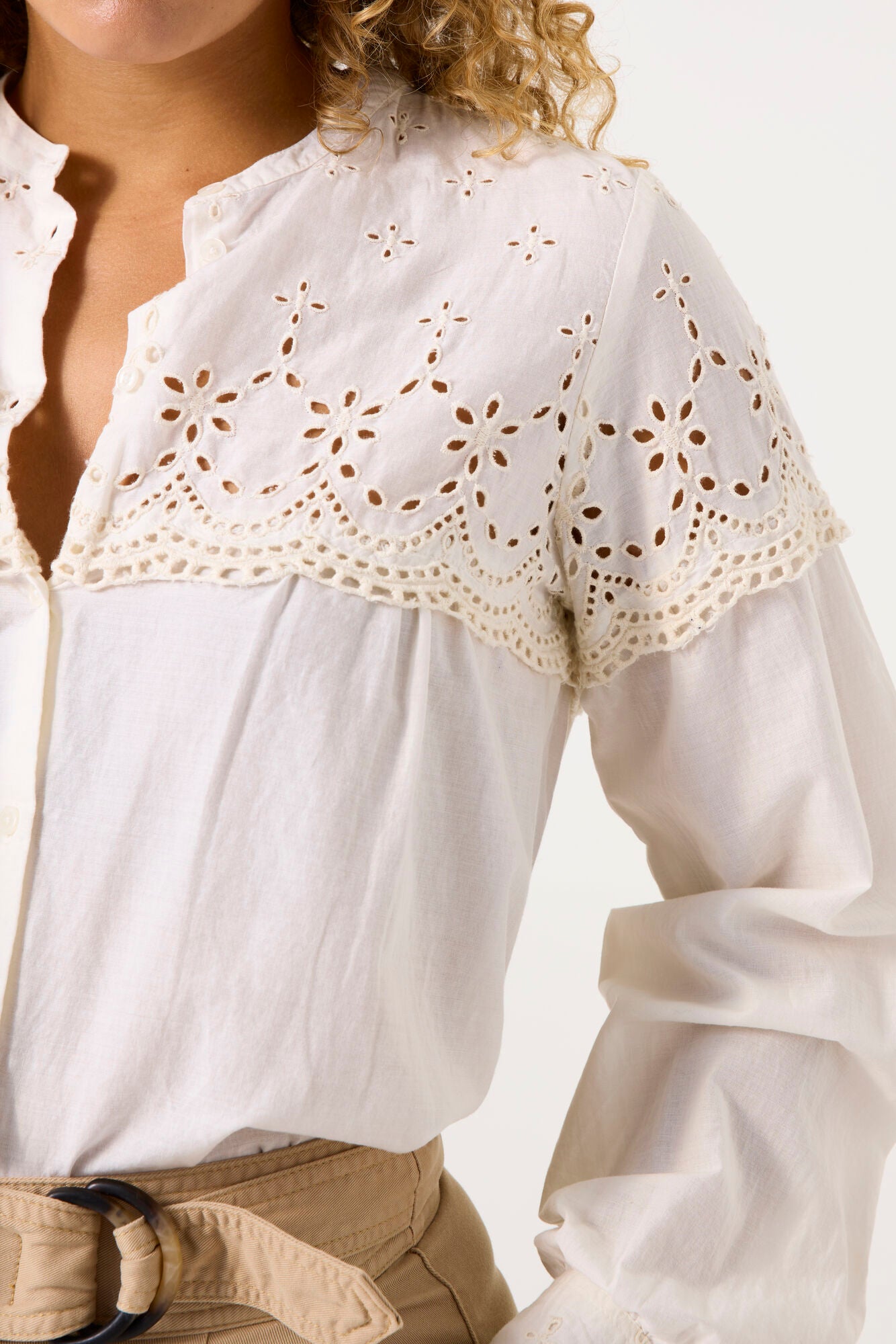 This embroidered shirt in off white cotton blends romantic detailing with modern simplicity. The design features an intricate broderie anglaise pattern across the upper bodice and shoulders, creating a delicate feminine texture that contrasts beautifully with the smooth lower fabric.