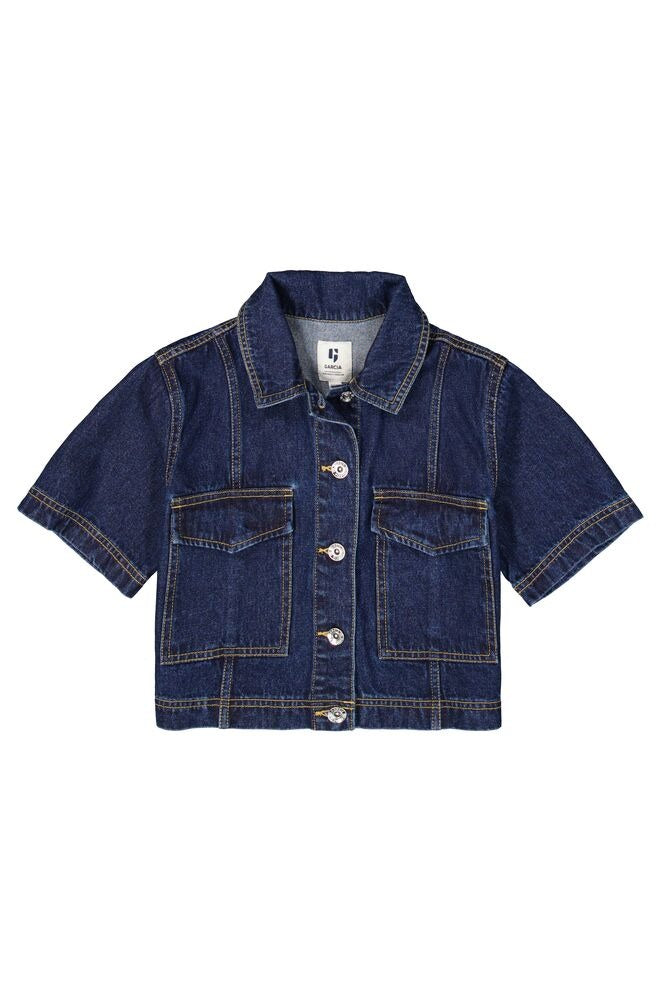 This jacket features a classic collar, short sleeves, and a relaxed fit.