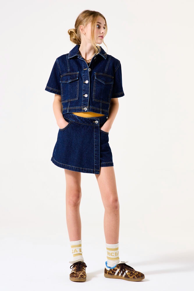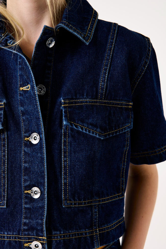 Cropped denim jacket with button closure.