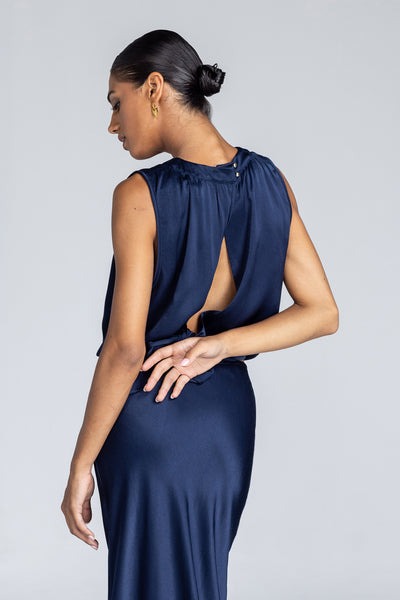 Made from a lustrous high-shine viscose satin, the Exuberance Top brings a bold yet refined elegance to any occasion. Featuring a softly gathered neckline and a voluminous silhouette that cinches at the waist, this sleeveless style offers an effortlessly modern shape. The open back reveals a split detail and finishes with a generous self-tie bow, balancing sophistication with a subtle flash of skin.