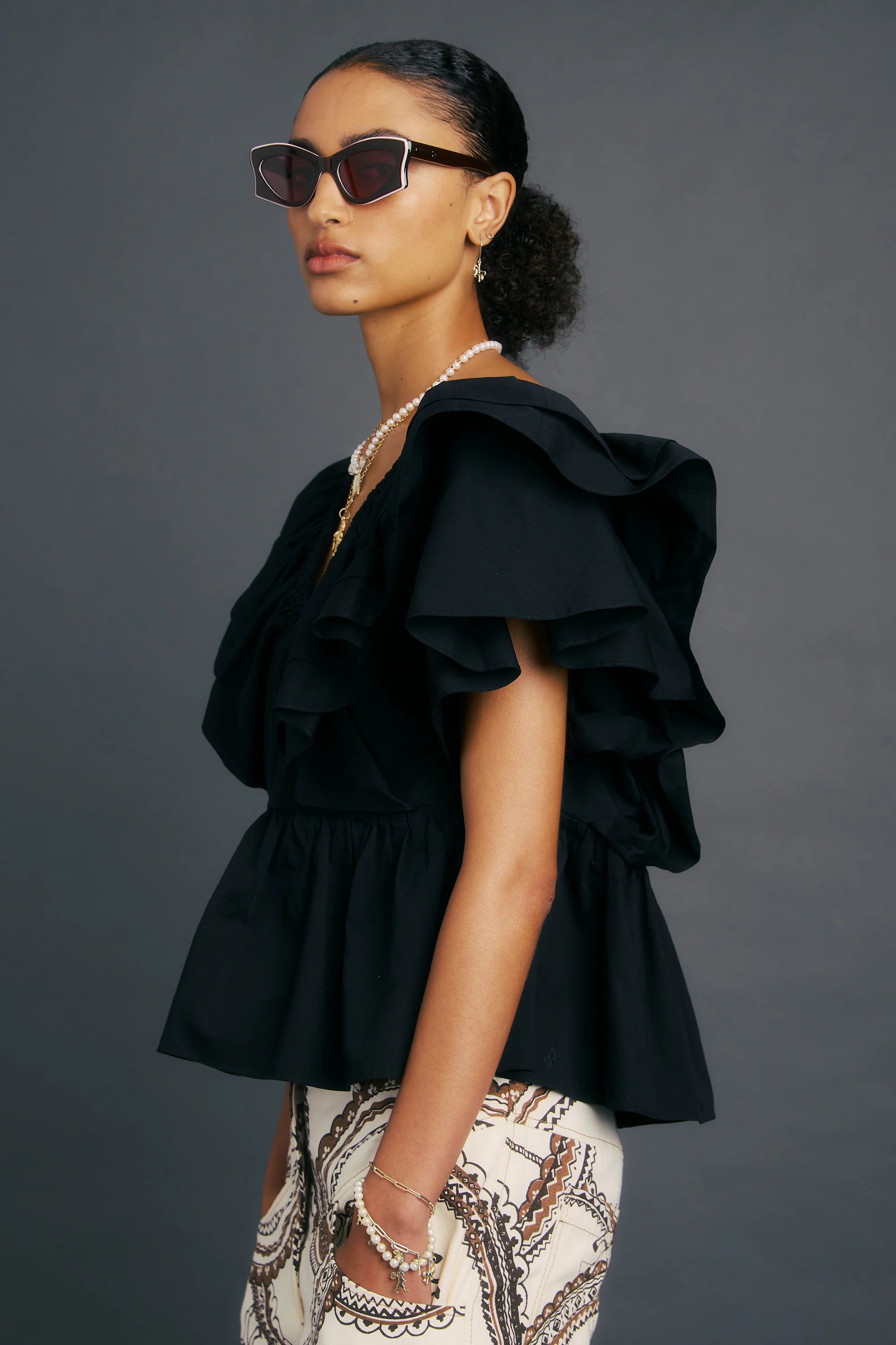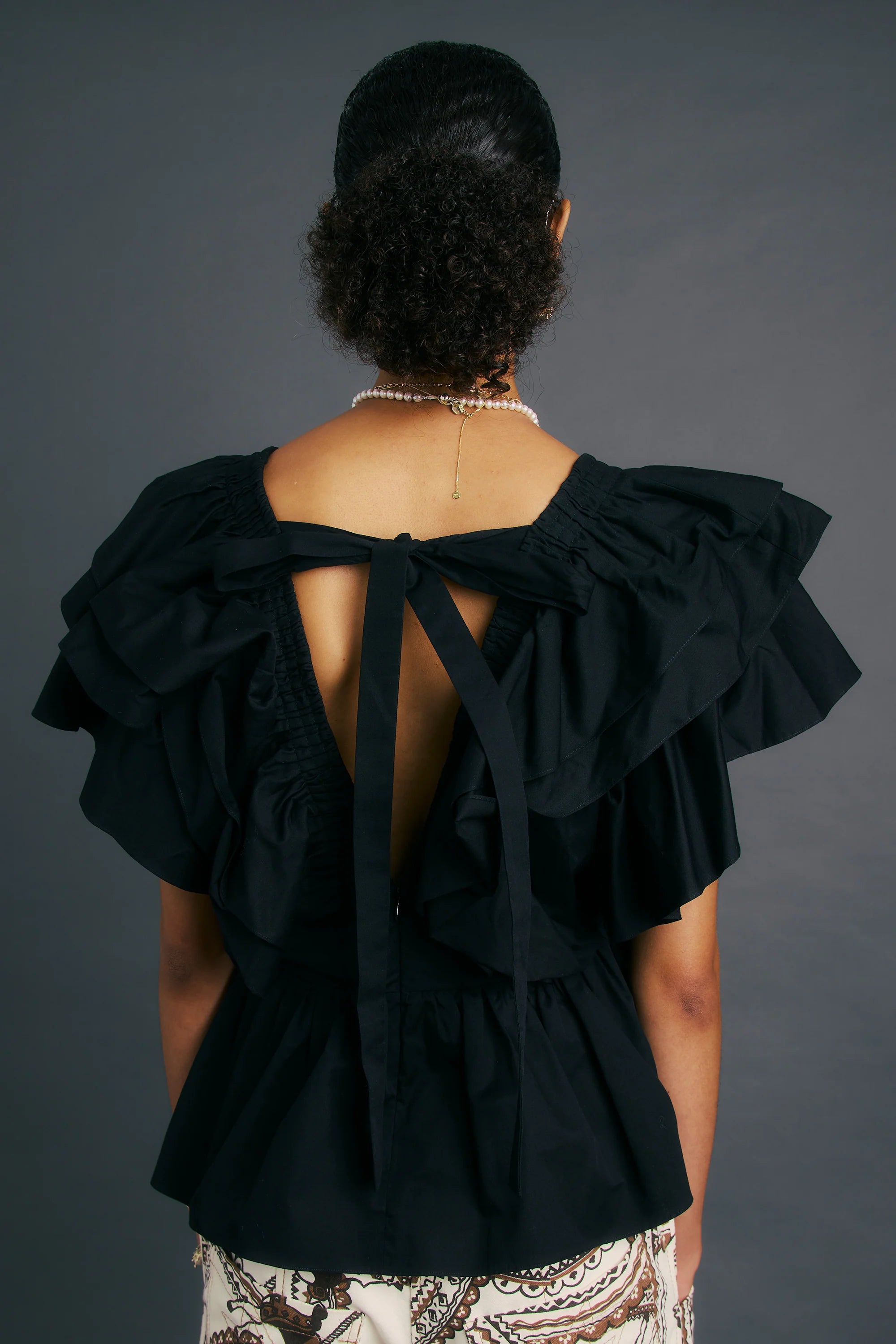 The Funfair Top is a versatile statement piece, crafted in organic cotton poplin. Cascading ruffles frame the shoulders before spilling into a voluminous peplum waist, balanced with a flattering neckline and bow tie closure.